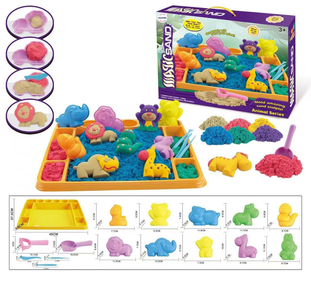 Súčasťou balenia je bohaté príslušenstvo – farebné formičky v tvare zvieratiek, lopatky, hrabličky aj podložka na stavanie. Vďaka rôznym farbám piesku môžu deti vytvárať ešte zábavnejšie a farebnejšie výtvory. Súprava je vhodná na doma aj na cesty, pretože sa piesok nerozypáva a ľahko sa upratuje.