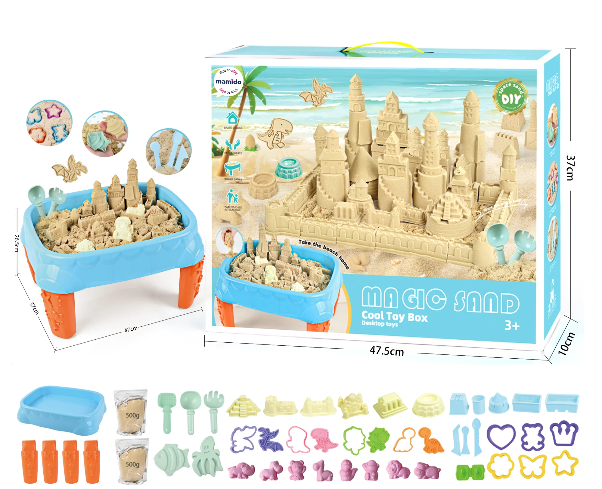 Fantázia naplno – tvorenie, modelovanie a stavanie vlastného sveta z piesku priamo doma. Hrací stolík udrží piesok pekne pohromade, formičky vytvoria dokonalé detaily hradov a nadstavce lopatiek pomôžu s modelovaním tvarov. Ideálna súprava na kreatívne tvorenie v detskej izbe.