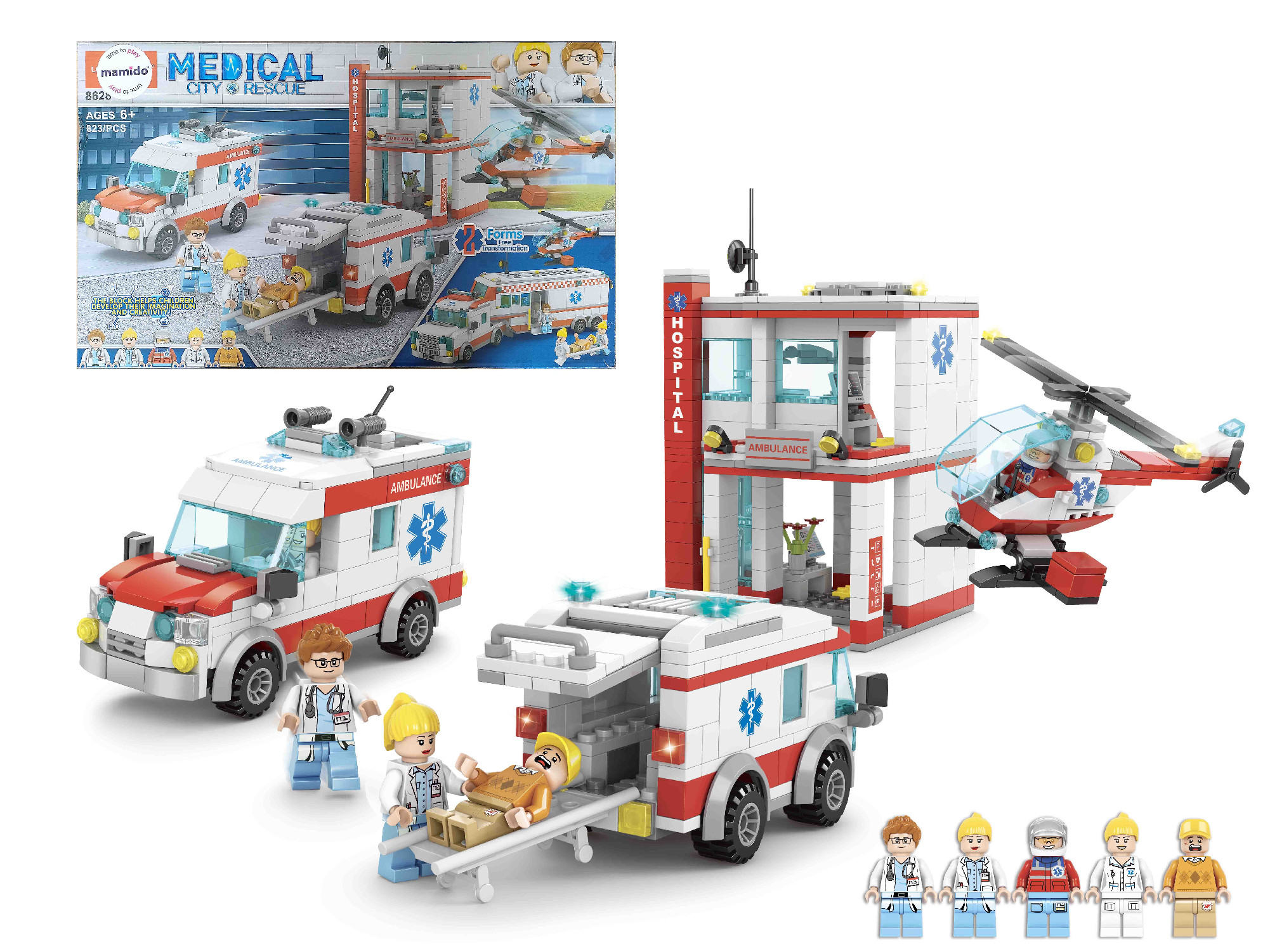Sanitka je vybavená posuvnými dverami a priestranným interiérom, čo umožňuje ľahké vkladanie figúrok aj nosidiel. Záchranársky vrtuľník dopĺňa atmosféru akcie a podporuje fantáziu malých staviteľov.