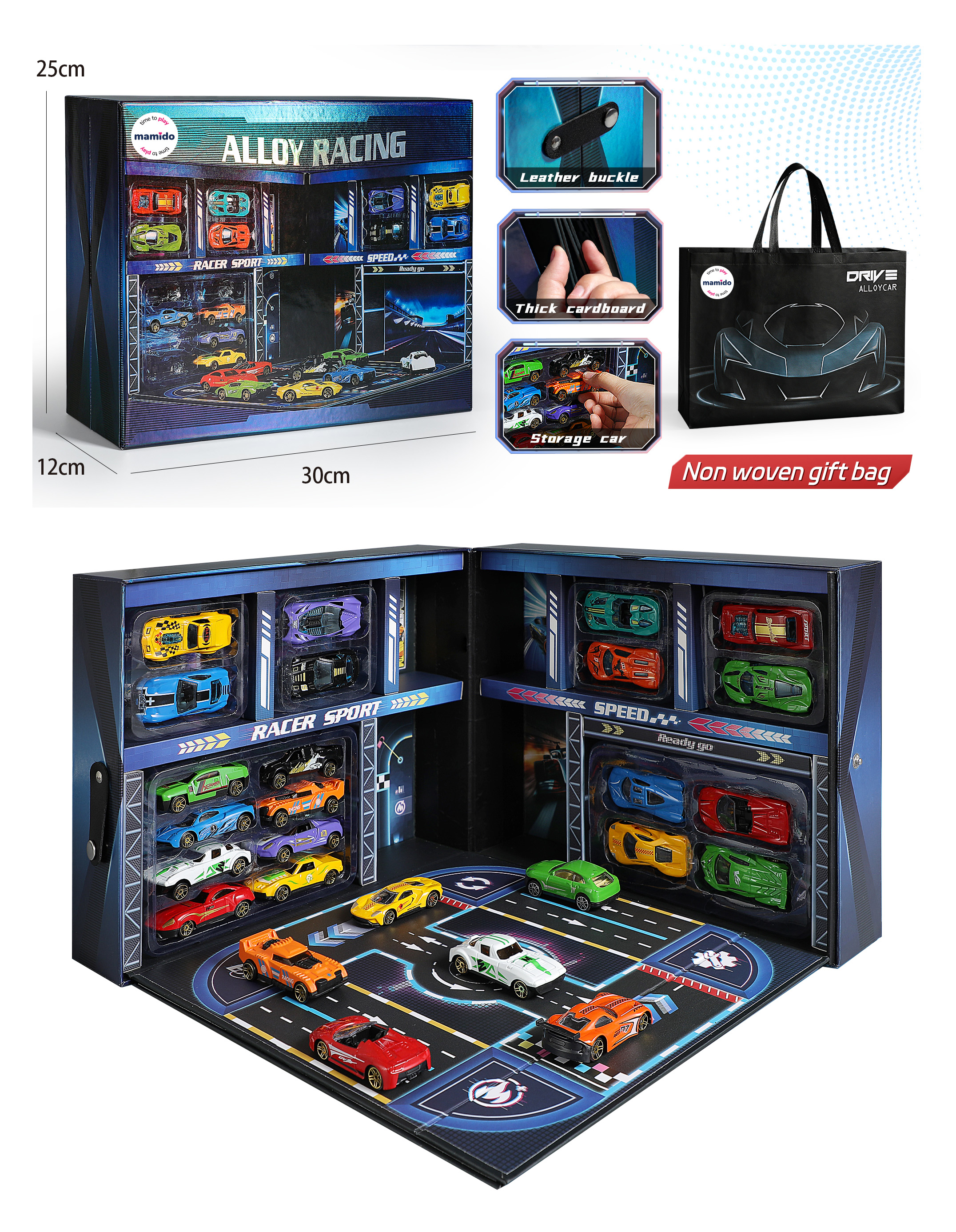 Štýlová súprava kovových športových áut so závodným garážovým boxom. Dizajn kufríka s rúčkou slúži ako prenosná garáž, vnútri je pretekárska plocha + parkovacie poschodia na vystavenie autíčok. Deti si tak môžu nielen hrať, ale zároveň autá aj upratať späť do boxu.