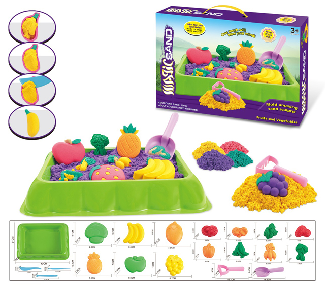Sada obsahuje rôzne formičky s motívmi ovocia a zeleniny, podložku na hranie a nástroje, vďaka ktorým deti ľahko vytvoria farebné postavičky, ovocie či celé scény. Kinetický piesok podporuje jemnú motoriku, kreativitu aj fantáziu a je skvelou alternatívou k bežnému modelovaniu.