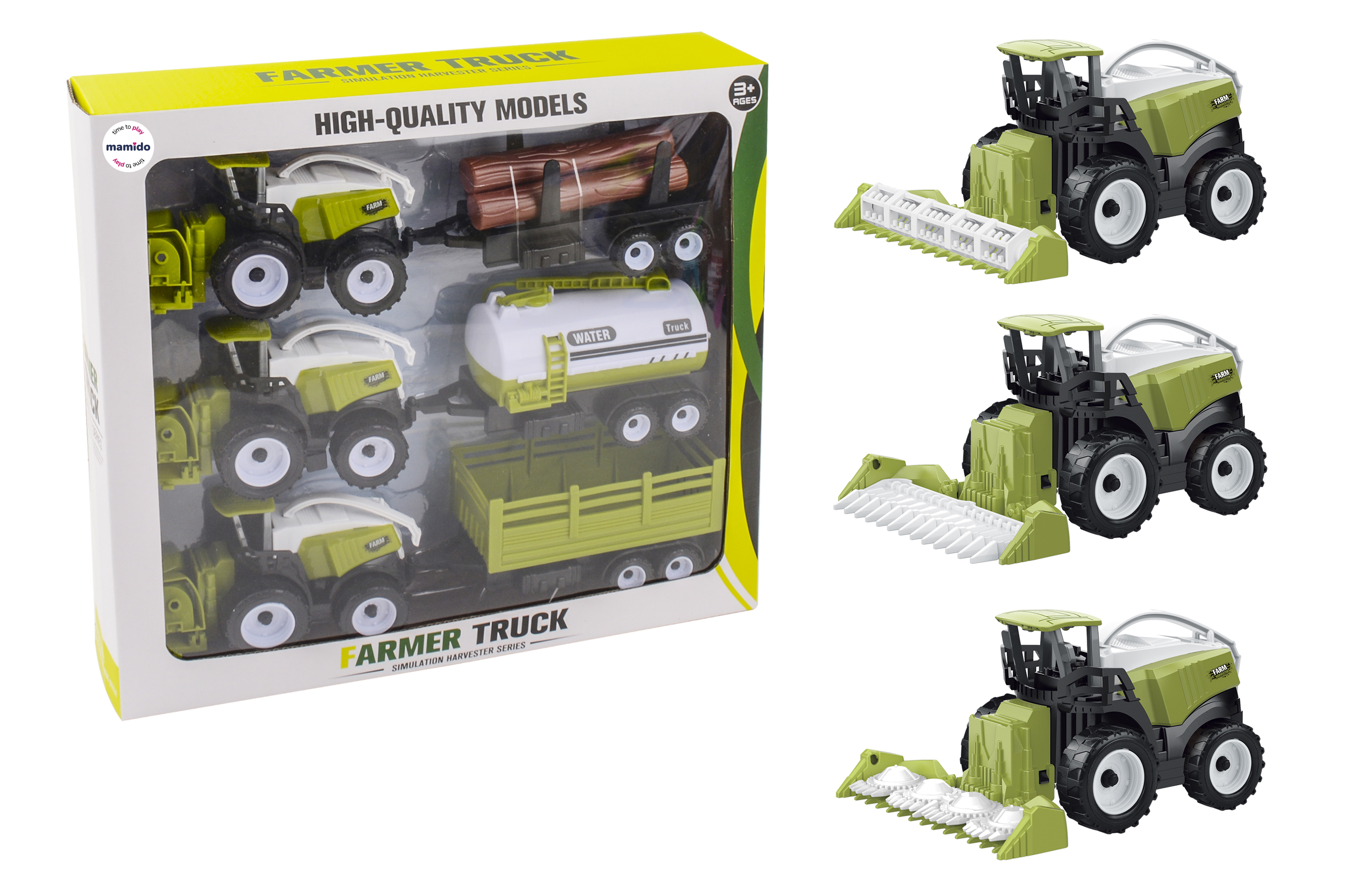 Realistická súprava troch farmárskych kombajnov s prívesmi poteší všetkých malých fanúšikov poľnohospodárskych strojov. Každý kombajn má vlastnú žaciu lištu a k nemu pripojiteľný príves – cisternu na vodu, príves na drevo a nákladný farmársky príves. Vďaka detailnému spracovaniu a odolnému plastovému vyhotoveniu si deti môžu užiť hodiny hrania na farmára.