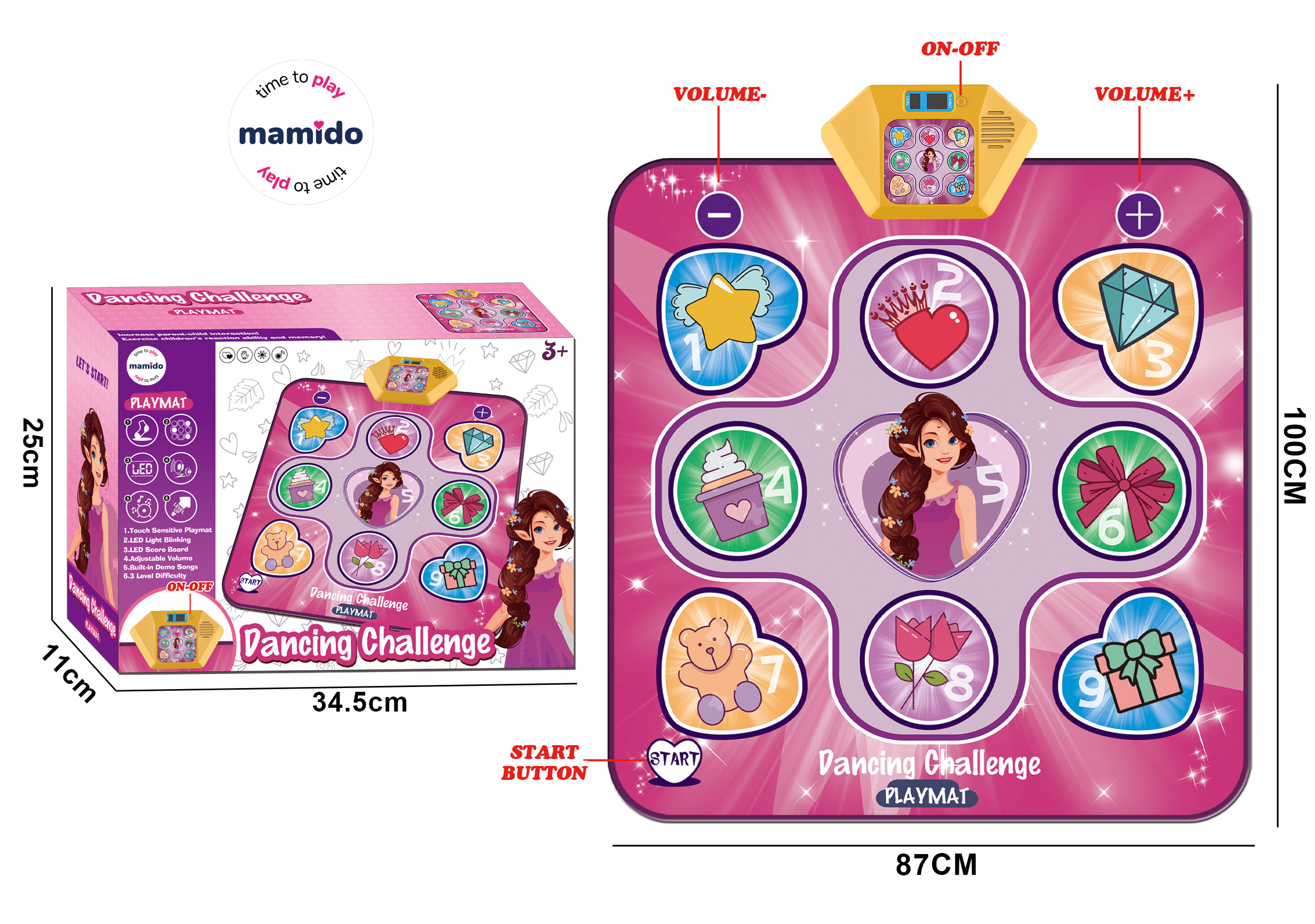 Zábavná interaktívna tanečná podložka s LED svetlami a hudbou vtiahne deti do sveta rytmu a pohybu. Stačí stlačiť ŠTART, sledovať blikajúce symboly a šliapnuť na správne miesto. Podložka ponúka viac úrovní obtiažnosti, takže je vhodná ako pre začiatočníkov, tak aj pre malých tanečných majstrov. Podporuje koordináciu, rytmus a zároveň prináša veľa pohybu a radosti.