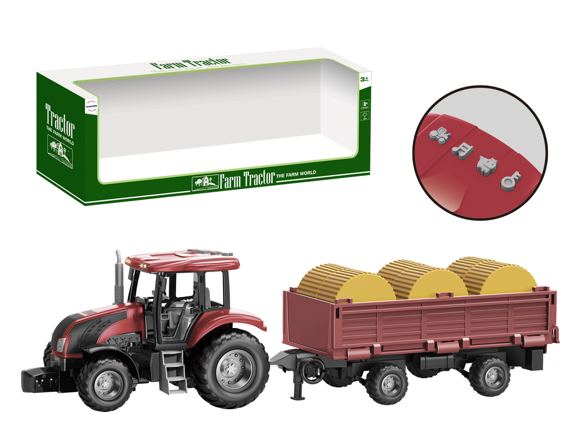 Vlečka je vybavená tromi guľatými balíkmi sena, ktoré možno nakladať a vykladať. Samotný traktor má detailné prevedenie s robustnými kolesami a ovládacími tlačidlami na kapote. Deti si môžu prehrávať farmárske scény plné žatvy, prevozu sena alebo práce na poli. Hračka podporuje kreatívne hranie, rozvoj fantázie a motoriky.