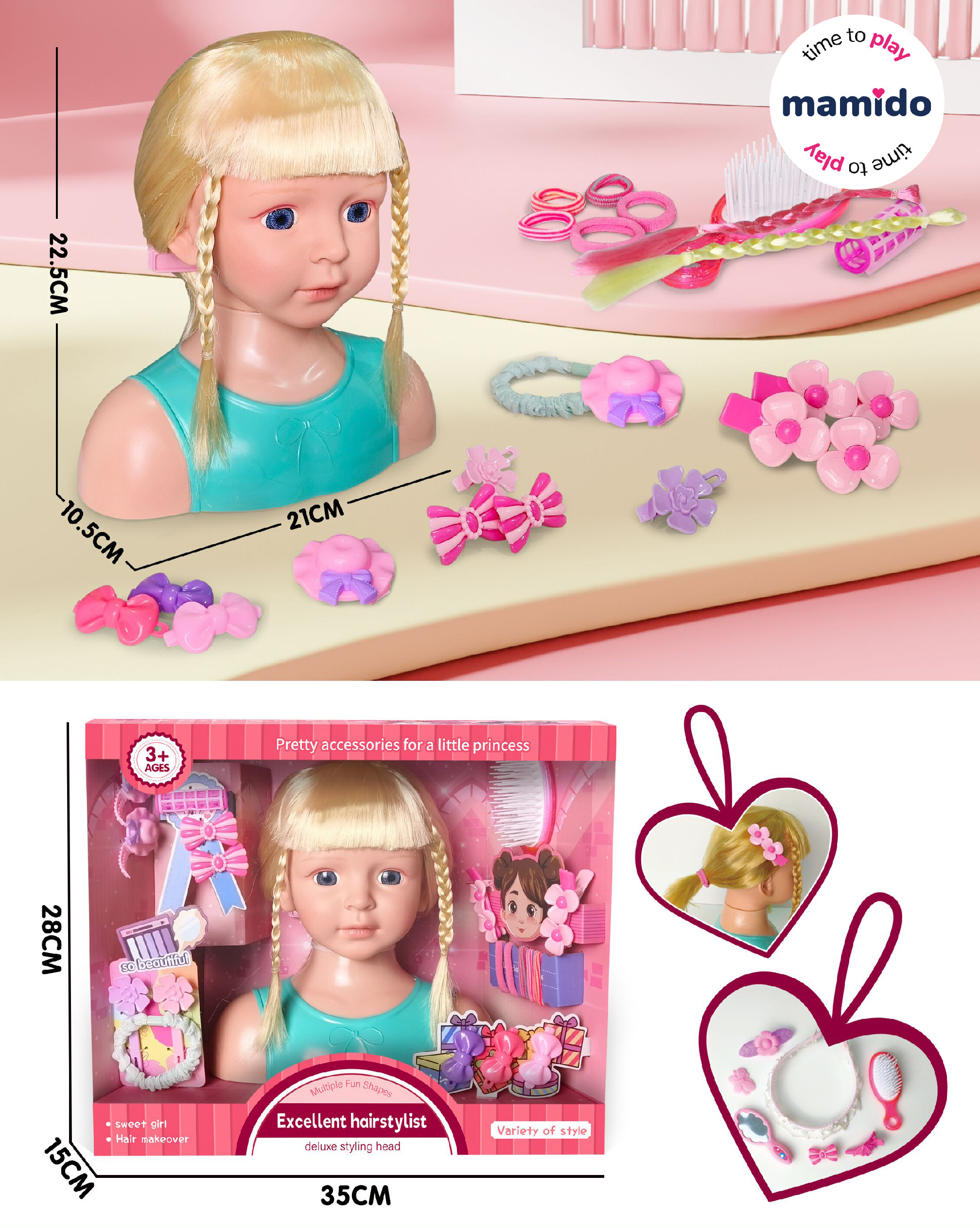 Hlavička na česání s doplnkami je skvelou hračkou pre všetky malé milovníčky účesov a módy. Vďaka realisticky vyhotovenej hlavičke s dlhými blond vlasmi môžu deti trénovať česanie, zapletanie vrkočov aj tvorbu originálnych účesov. Súčasťou balenia je bohatá súprava doplnkov, ktorá zahŕňa hrebienok, farebné gumičky, sponky a ozdobné štipce, takže kreatívne hranie nemá žiadne medze.