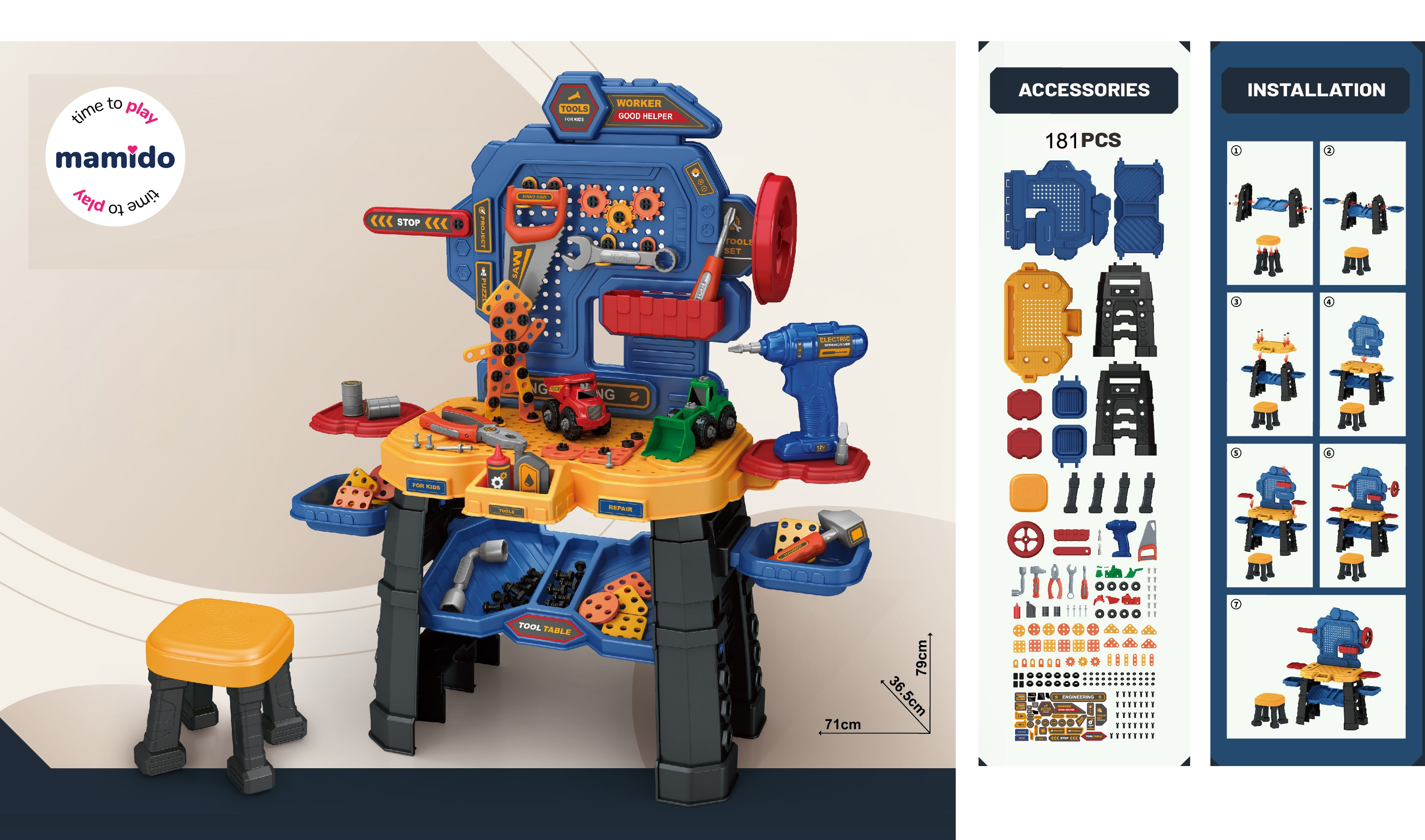 Ak vaše dieťa rado pomáha ockovi s majstrovaním, bude pre neho táto súprava ideálna. Súprava je vyrobená z vysoko kvalitných materiálov a obsahuje 181 dielov. Vaše dieťa si môže zostaviť majstrovací stolík/dielňu a usporiadať na ňom všetko náradie potrebné na prácu. Vŕtačka je napájaná 2 x 1,5V AA batériami (nie sú súčasťou balenia) a možno ju použiť na skrutkovanie a vyskrutkovanie skrutiek.