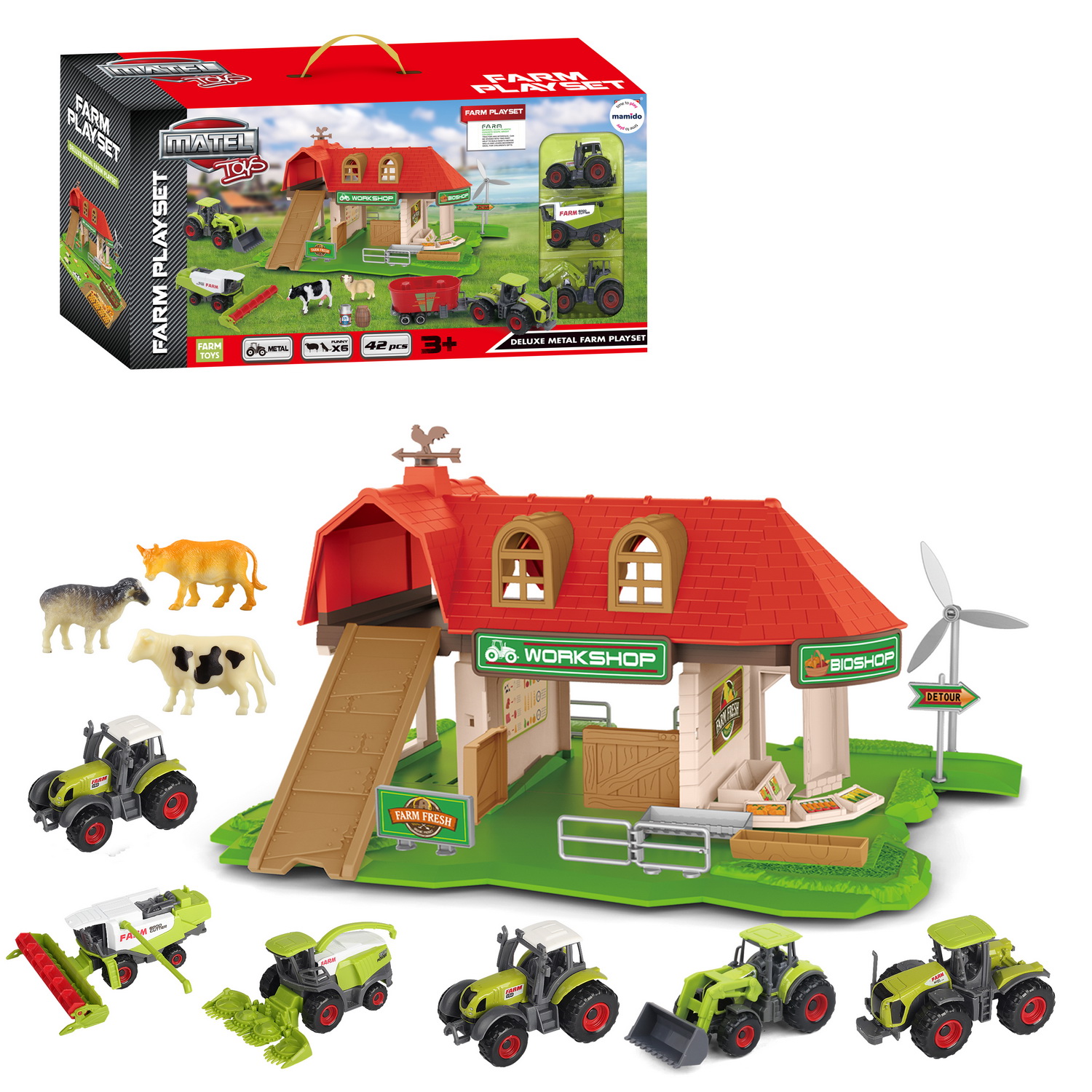 Rozsiahla farmárska herná súprava prináša deťom skvelú kombináciu kovových vozidiel, farmárskych budov a zvieracích figúrok. Dominantou je veľká farma s parkovacím priestorom a ďalšími prvkami, ktoré deťom umožnia vytvárať vlastné vidiecke príbehy. Kovové traktory a doplnky pridávajú hračke na odolnosti, zatiaľ čo figúrky hospodárskych zvierat zaisťujú realistický herný zážitok.