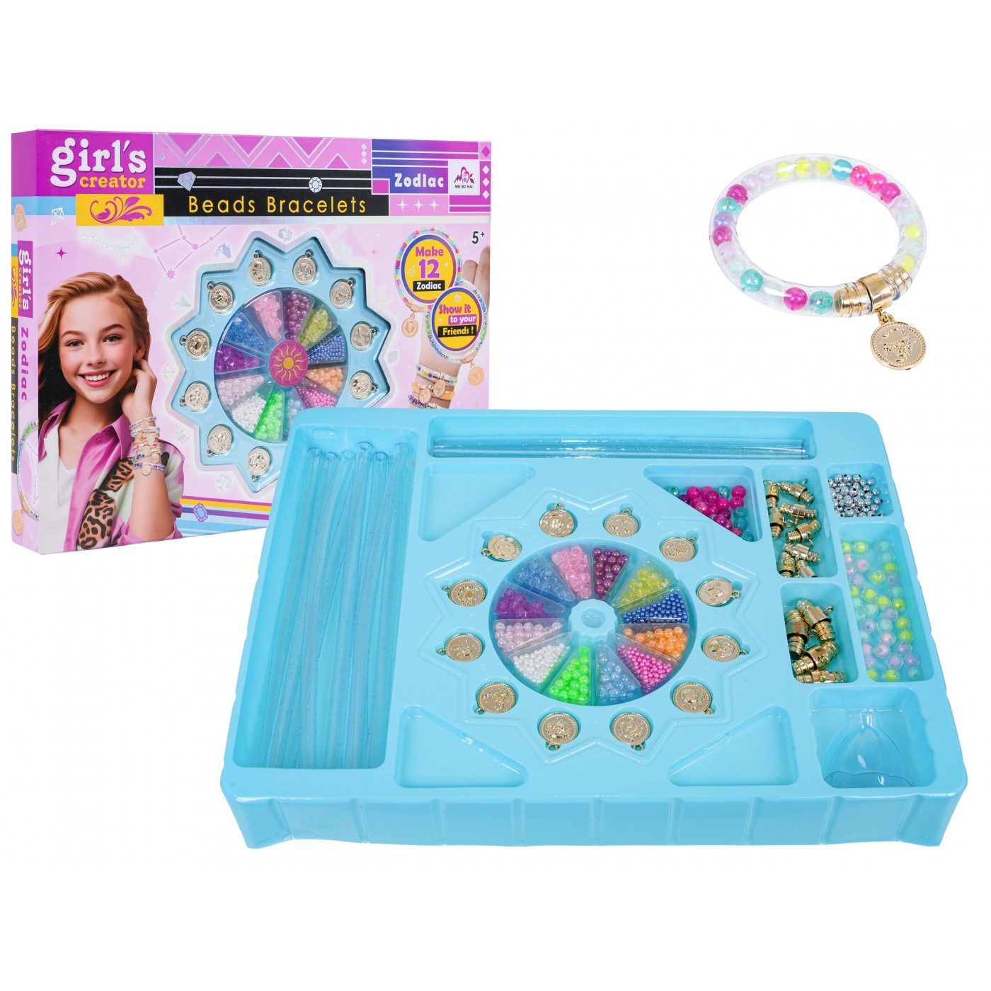 Kreatívna sada na výrobu náramkov pre deti od piatich rokov. Bohato vybavená súprava je vyrobená z najkvalitnejších materiálov, ktoré sú bezpečné pre deti. Súprava bude skvelým nástrojom na rozvoj fantázie a kreatívneho myslenia. Šperky vyrobené dieťaťom budú jedinečné a neopakovateľné. Súprava obsahuje priehľadné trubičky na výrobu náramkov, farebné korálky a prívesky so znameniami zverokruhu.