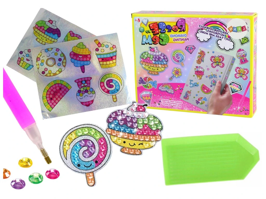 Táto sada s doplnkami na vytváranie jedinečných nálepiek je ideálna pre najmenších tvorcov. Inovatívna technika lepenia diamantov umožňuje vytvárať krásne obrázky prilepením malých diamantov na nálepky s roztomilými motívmi sladkostí , ktoré sú súčasťou tejto sady.