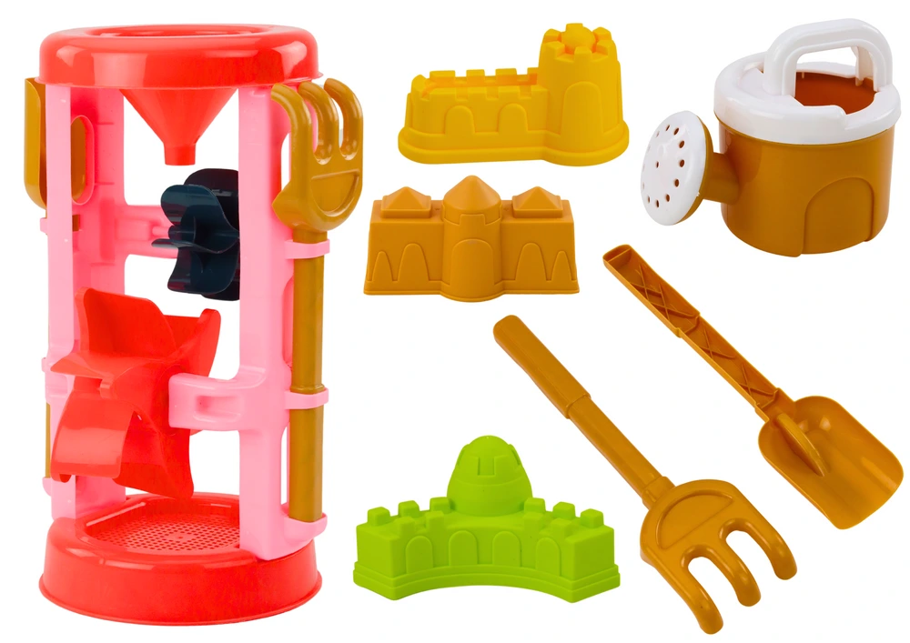 Zostav hračiek do piesku s mlynčekom je perfektná sada pre deti, ktoré milujú hranie na pláži alebo v pieskovisku. Hlavným prvkom sady je veľký mlynček, ktorý prináša veľa radosti a možností kreatívnej hry. Mlynček je navrhnutý pre všestranné použitie: z jednej strany má sitko, ktoré umožňuje preosievanie piesku, az druhej strany lievik, ktorým piesok voľne prúdi a poháňa kolesá mlynka.