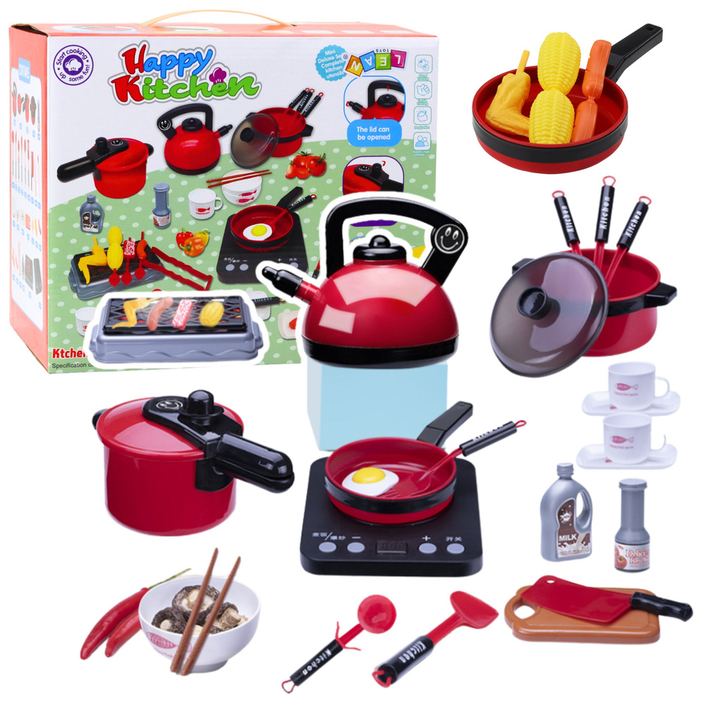 Sada detského riadu je jedinečnou ponukou pre deti, ktoré sa rady hrajú na kuchára. Sada obsahuje až 36 prvkov , ktoré napodobňujú skutočný riad, kuchynské náčinie a ingrediencie na varenie. Medzi prvky patrí rýchlovarná kanvica, panvica, tlakový hrniec, hrniec s pokrievkou, gril, doštička na krájanie, sushi s paličkami a pojazdná varná doska so zvukmi vyprážania a varenia. Všetko je vyrobené s dôrazom na detail av atraktívnom červeno-čiernom farebnom prevedení.