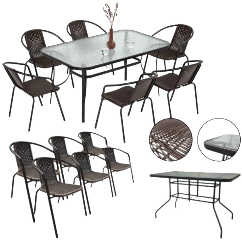 Štýlová a praktická sada záhradného nábytku , ktorá sa skladá z veľkého obdĺžnikového stola so sklenenou doskou a 6 pohodlných stoličiek. Ide o kompletné riešenie, ktoré sa bude skvele hodiť na terasu, balkón, do altánku alebo na záhradu. Súprava kombinuje moderný vzhľad s odolnosťou a ponúka komfortné používanie po mnoho sezón.