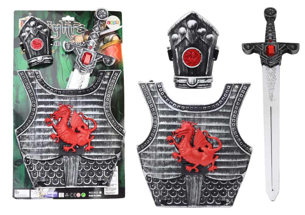 Meč a brnenie sú hlavnými prvkami sady, pôsobia impozantne v hnedo-strieborných farbách, čo im dodáva ušľachtilosť a autentický vzhľad. Na štíte je vyobrazené červené logo draka, ktoré pridáva charakter a výraznosť, zvýrazňujúcu rytiersky motív. Meč ohromuje svojou robustnou konštrukciou a realistickým vzhľadom, umožňuje dynamické súboje vo svete fantastických príbehov. Disponuje zvukovými efektmi, ktoré robia hru s ním nesmierne vzrušujúcou a plnou emócií.