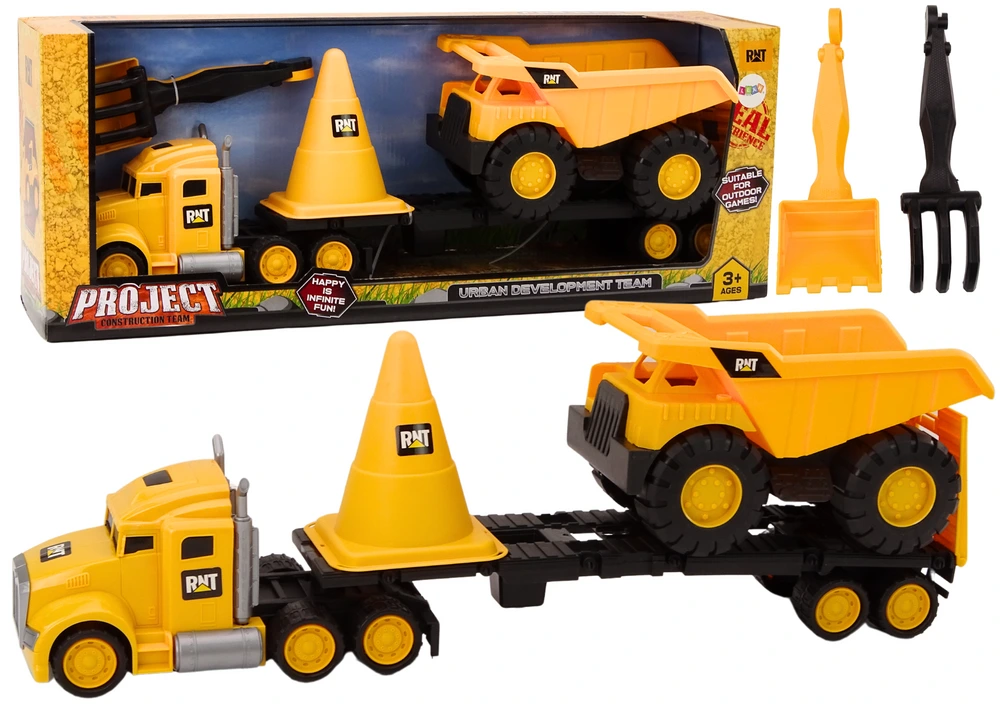 Stavebné hračky tohto setu sú skutočným pokladom pre každého malého staviteľa! V sete nájdete žlté nákladné auto s návesom, sklápač, veľký žltý kužeľ a lopatku s hrabličkami, ktoré zaistia hodiny nekončiacej zábavy ako doma, tak aj vonku.