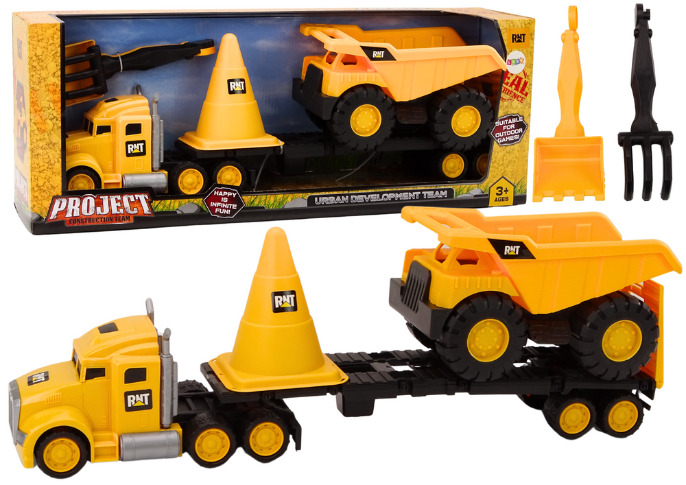 Nákladné auto s návesom uľahčí prepravu sklápača. Hrabličky a lopatka sú ideálnym nástrojom na kopanie a tvarovanie pieskových stavieb, zatiaľ čo kužeľ pomôže zabezpečiť priestor.
