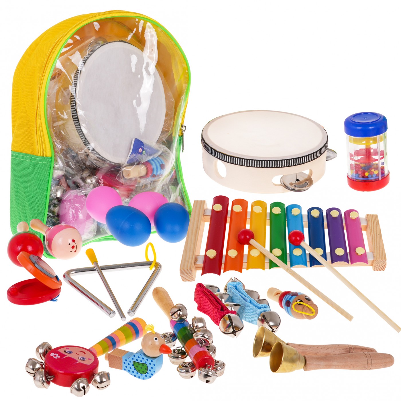 Veľká sada drevených hudobných nástrojov pre deti od 2 rokov. Drevené nástroje sú veľmi odolné a nadčasové. Sú navyše farebné a pre dieťa úplne bezpečné. Sada sa skladá z 23 prvkov a obsahuje batoh, do ktorého je možné všetky nástroje uložiť a vziať všade so sebou.