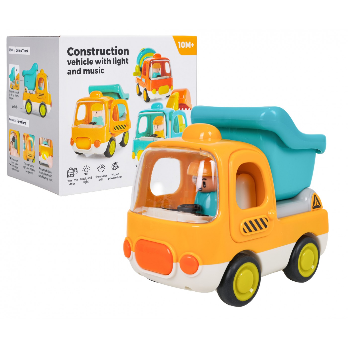 Interaktívna sklápacie autíčko so zvukovými a svetelnými efektmi pre deti od desiatich mesiacov veku. Hračka je vyrobená z odolného a bezpečného plastu, nemá ostré hrany a vydrží aj tú najenergetickejšiu hru. Živé farby priťahujú pozornosť dieťaťa a podnecujú k hre. Zvukové a svetelné efekty stimulujú zmysly dieťaťa a dodávajú hre na realizme. Kolesá sa ľahko pohybujú po podlahe a dvere a výložník s rebríkom sú pohyblivá. Hračka je napájaná 3 batériami typu AG13 (súčasťou balenia).