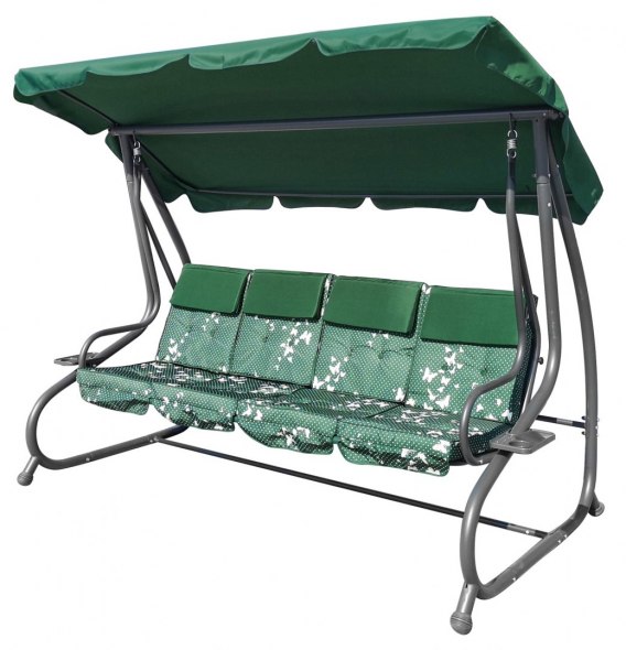 Záhradná hojdačka so sklopným sedákom a regulovateľnou strieškou pre 4 osoby.