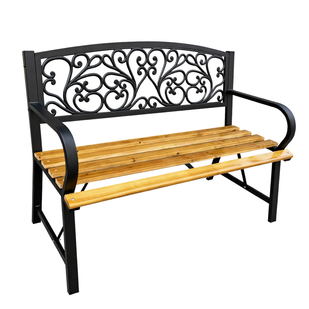 Elegantná záhradná lavica kombinujúca kov a prírodné drevo je ideálnou voľbou pre štýlové a pohodlné posedenie na záhrade, terase, balkóne aj verande. Spojenie pevnej oceľovej konštrukcie a dreveného sedadla z jedle vytvára harmonický vzhľad, ktorý skvele zapadne do moderných aj klasických vonkajších priestorov. Dekoratívne operadlo dodáva lavici osobitý charakter a zároveň poskytuje pohodlnú oporu pri odpočinku. Vďaka kvalitnému spracovaniu je lavica odolná voči každodennému používaniu aj vonkajším podmienkam.