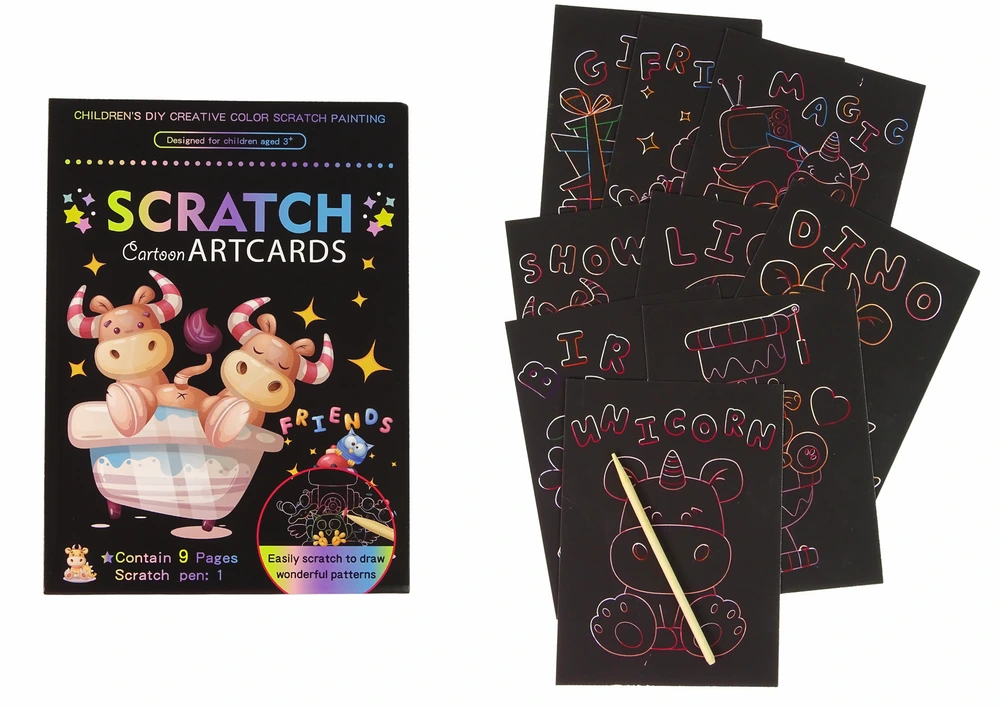 V sade nájdete 9 obrázkov na zoškrabanie. Zábava je jednoduchá: pomocou špeciálnej drevenej špajle môžete z obrázku zoškriabať čiernu vrstvu a odhaliť krásne a farebné ilustrácie.