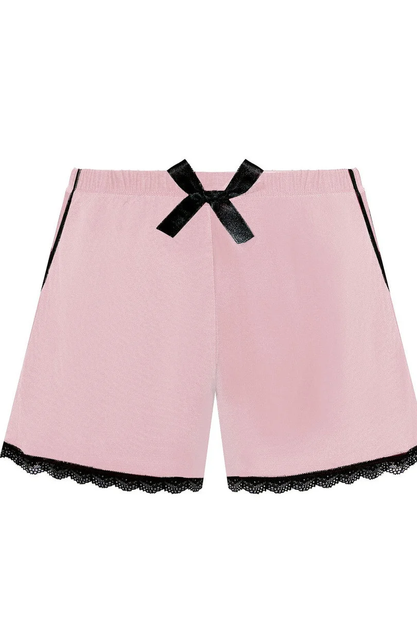 Krátke šortky Viscosa. Nohavice zakončené čipkou, bočné vrecká v páse s ozdobnou saténovou mašľou.Zloženie: 70% viskóza, 8% elastan, 8% ostatné vlákna .