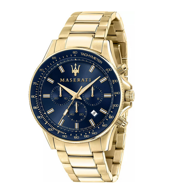 Maserati Sfida R8873640008 sú elegantné a moderné pánske hodinky. Tmavomodrý ciferník, chránený minerálnym sklom a obklopený tmavomodrou lunetou, má okienko s dátumom a subciferníky zobrazujúce chronograf a denný čas. Zlatý náramok a puzdro sú vyrobené z vysoko kvalitnej nehrdzavejúcej ocele. Hodinky sú vodeodolné do WR100, čo umožňuje plávanie a plytké potápanie bez toho, aby ste museli hodinky vybrať. Skrutkovateľná korunka a zadný kryt puzdra ďalej utesňujú vnútro puzdra. ŠPECIFIKÁCIE: Strojček: QuartzPuzdro a náramok z nehrdzavejúcej oceleSkrutkovateľný zadný kryt puzdra a korunka FUNKCIE: Zobrazenie dátumuChronograf24-hodinový displejTrieda vodeodolnosti WR100 ROZMERY: Šírka puzdra: 44 mmHrúbka puzdra: 11 mmŠírka náramku: 22 mmMaximálny vnútorný obvod: cca. 21 cm FARBY: Ciferník: Námornícka modráNáramok: ZlatýPuzdro: Zlaté SÚČASŤOU BALENIA: 24-mesačná záruka výrobcuElegantná originálna krabička Maserati, ideálna ako darček
