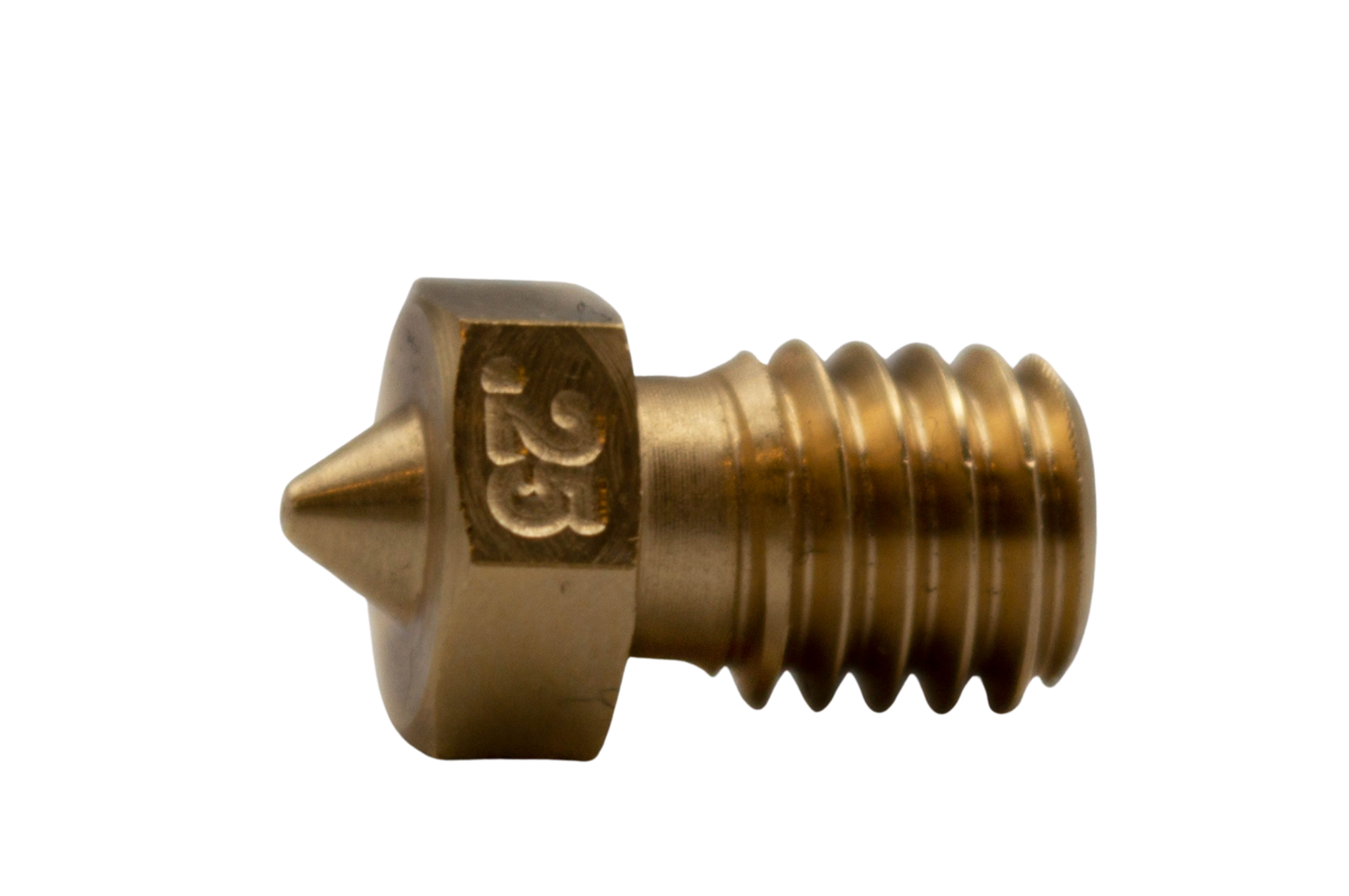 Kvalitná mosadzná tryska 0,25 mm so závitom M6 vhodná k tlači 1,75 mm širokej struny. Tryska je časť tlačovej hlavy (extruderu), ktorá určuje ako detailný bude Váš výtlačok. Použitím trysky s menším otvorom dosiahnete jemnejšej tlače, ale zároveň výrazne narastá celková doba tlače. Najpoužívanějšia je tryska priemeru 0,4 mm. Mosadzná tryska má výbornú tepelnú vodivosť a dobré mechanické vlastnosti a je preto vhodná pre väčšinu typov termoplastických materiálov (ABS, PLA, ASA, PET, PC, Nylon, ...), len v prípade použitia materiálov s vyššou abraziou (plast s prímesou kovových vlákien, flitrov, kovové materiály a pod.), odporúčame použiť trysku z ocele. Po naskrutkovaní trysky na hotend, odporúčame ohriať tlačovú hlavu na pracovnú teplotu (približne 230°C) a trysku za tepla dotiahnuť, aby nedochádzalo k netesnostiam. Tryska je vhodná napr. pre tlačiarne Elegant3D Printer 2, Prusa i3 a všetky dalšie, ktoré majú závit pre trysku veľkosti M6.