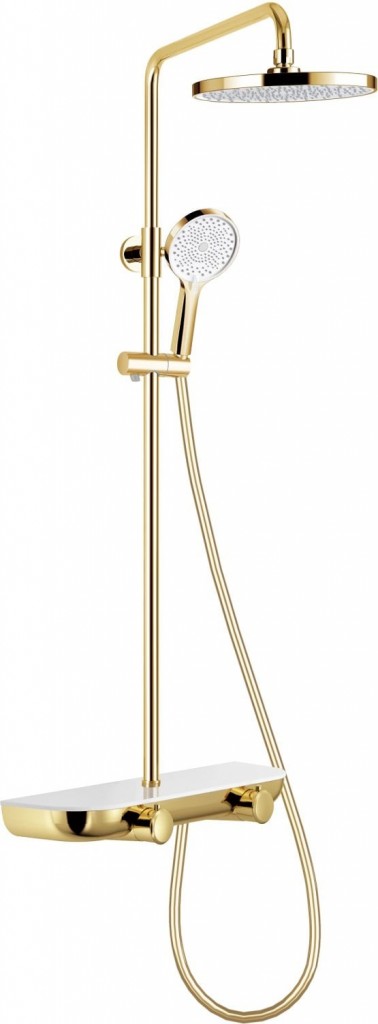 Špecifikácia produktu: Materiál stĺpu: Nerezová oceľ Povrchová úprava stĺpika: zlatá Výška: 800-1100 mm Šírka stĺpika: ø24 mm Vzdialenosť od steny: 420 mm Posuvný držiak na slúchadlo Materiál dažďovej sprchy: ABS Povrchová úprava dažďovej sprchy: zlatá/biela Rozmer dažďovej sprchy: ø225 mm Materiál slúchadla: ABS Povrchová úprava slúchadla: zlatá/biela Počet funkcií: 3 Materiál hadice: PVC Povrchová úprava hadice: Zlatá Dĺžka hadice: 150 cm Mosadzné hroty Hladký povrch uľahčuje údržbu Otočné hroty zabraňujú krúteniu Pružný materiál odolný proti rozťahovaniu a ohýbaniu Materiál batérie: Mosadzné telo Povrchová úprava faucetu: zlatá/biela Počet funkcií: 2 Praktická sklenená polička na kozmetiku(GT) Ean: 5905315927972
