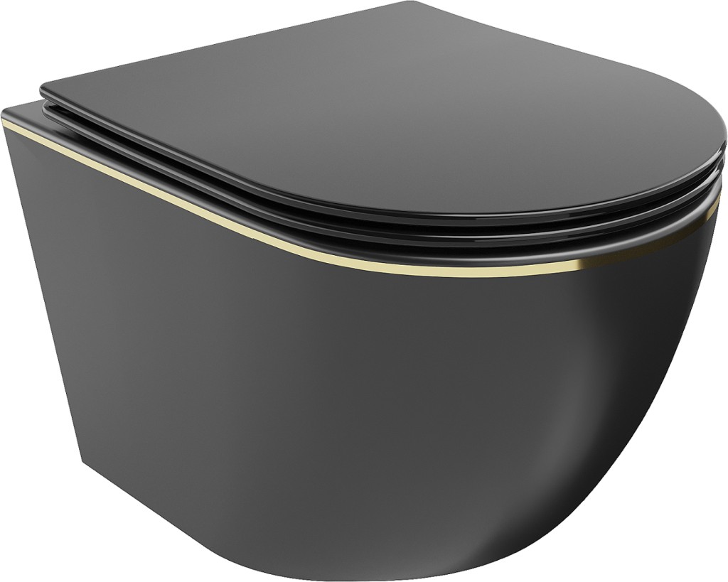 Technické dáta: Rozmer: 48 x 36 x 35,5 cm Montáž: Závesná Montážny rozstup: 18 cm Materiál: Sanitárna keramika Farba: Čierna matná/zlatá linka Typ odtoku: Horizontálne Splachovací systém: Rimless (bez okrajov) Typ dosky: Pomalé zatváranie Farba: Čierna matná Materiál: Duroplast Slim verzia: Áno Jednoduché uvoľnenie: Áno Kovové pánty: Áno Technológia Rimless zaisťuje voľné prúdenie vody v celej komore, čo uľahčuje udržiavanie čistoty záchodovej misy Žiadne zákutia, ostré hrany alebo neglazované plochy hromadiace baktérie a vodný kameň (GT) Ean: 5907709154544