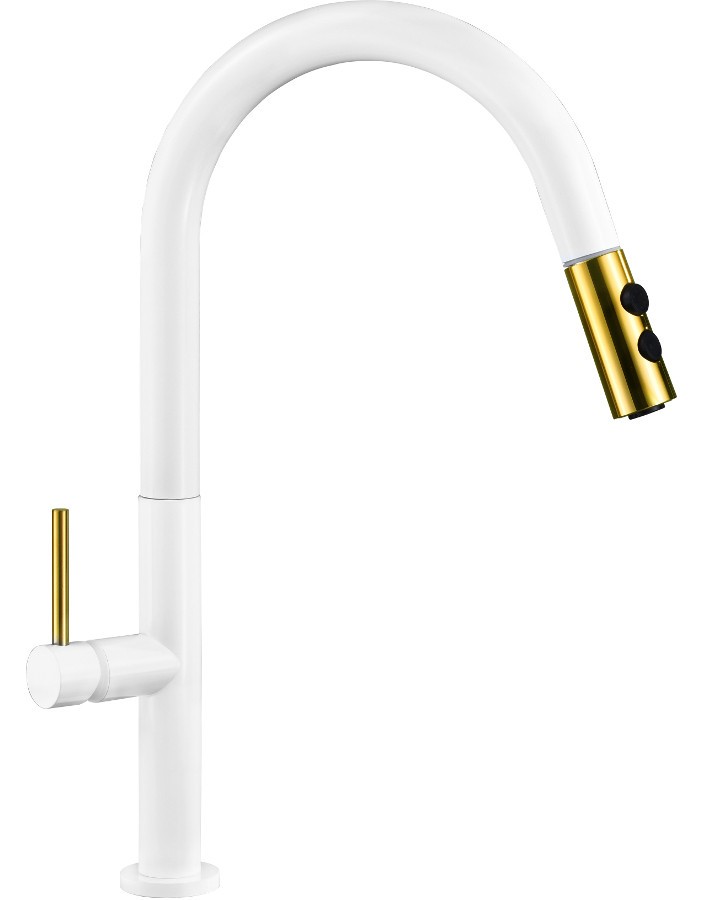 Technické dáta: Materiál: mosadz Povrchová úprava: biela / zlatá Hlava: Keramika Perlátor: Áno Typ výtoku: výsuvný Rozsah výtoku: 200 mm Výška: 410 mm Typ: Páka (GT) Ean: 5907709174337