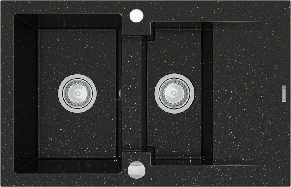 Technické dáta: Veľkosť: 737x475x177 mm Hĺbka komory: 167 mm (väčšie), 107 mm (menšia) Rozmery komory: 395x272 mm (väčšie), 375x182 mm (menšia) Priemer odtoku: ø90 mm Typ: 1,5 misy s krátkym odkvapkávačom Typ: Zapustené do dosky stola Farba: čierna / zlatá metalíza Materiál: žula Prepadový otvor: Áno Závit: Áno Vrátane automatického sifónu Vysoká odolnosť proti poškriabaniu a zafarbenie Odolnosť proti tepelným šokom Ľahko čistiteľný povrch(GT) Ean: 5907709194205