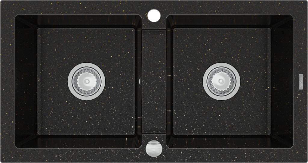 Technické dáta: Veľkosť: 820x436x161 mm Hĺbka komory: 151 mm Rozmery komory: 356x336 mm Priemer odtoku: ø90 mm Typ: 2komorový Typ: Zapustené do dosky stola Farba: čierna / zlatá metalíza Materiál: žula Prepadový otvor: Áno Závit: Áno Vrátane automatického sifónu Vysoká odolnosť proti poškriabaniu a zafarbenie Odolnosť proti tepelným šokom Ľahko čistiteľný povrch (GT) Ean: 5907709193963
