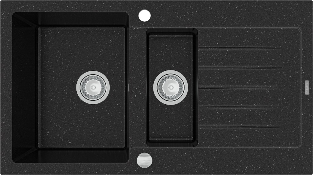 Technické dáta: Veľkosť: 900x505x173 mm Hĺbka komory: 170 mm (väčšie), 115 mm (menšia) Rozmery komory: 435x335 mm (väčšie), 345x150 mm (menšia) Priemer odtoku: ø90 mm Typ: 1,5 misy s krátkym odkvapkávačom Typ: Zapustené do dosky stola Farba: čierna / strieborná metalíza Materiál: žula Prepadový otvor: Áno Závit: Áno Vrátane automatického sifónu Vysoká odolnosť proti poškriabaniu a zafarbenie Odolnosť proti tepelným šokom Ľahko čistiteľný povrch Dva ďalšie vyfrézované otvory pre vlastné dierovanie ø35 (GT) Ean: 5907709193796