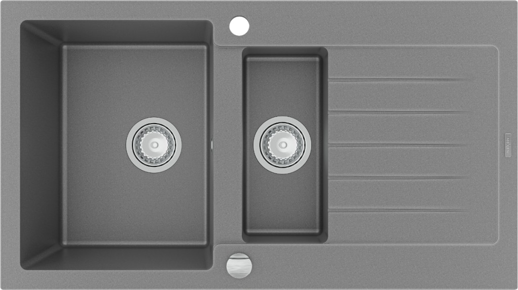 Technické dáta: Veľkosť: 900x505x173 mm Hĺbka komory: 170 mm (väčšie), 115 mm (menšia) Rozmery komory: 435x335 mm (väčšie), 345x150 mm (menšia) Priemer odtoku: ø90 mm Typ: 1,5 misy s krátkym odkvapkávačom Typ: Zapustené do dosky stola šedá farba Materiál: žula Prepadový otvor: Áno Závit: Áno Vrátane automatického sifónu Vysoká odolnosť proti poškriabaniu a zafarbenie Odolnosť proti tepelným šokom Ľahko čistiteľný povrch Dva ďalšie vyfrézované otvory pre vlastné dierovanie ø35 (GT) Ean: 5907709193789