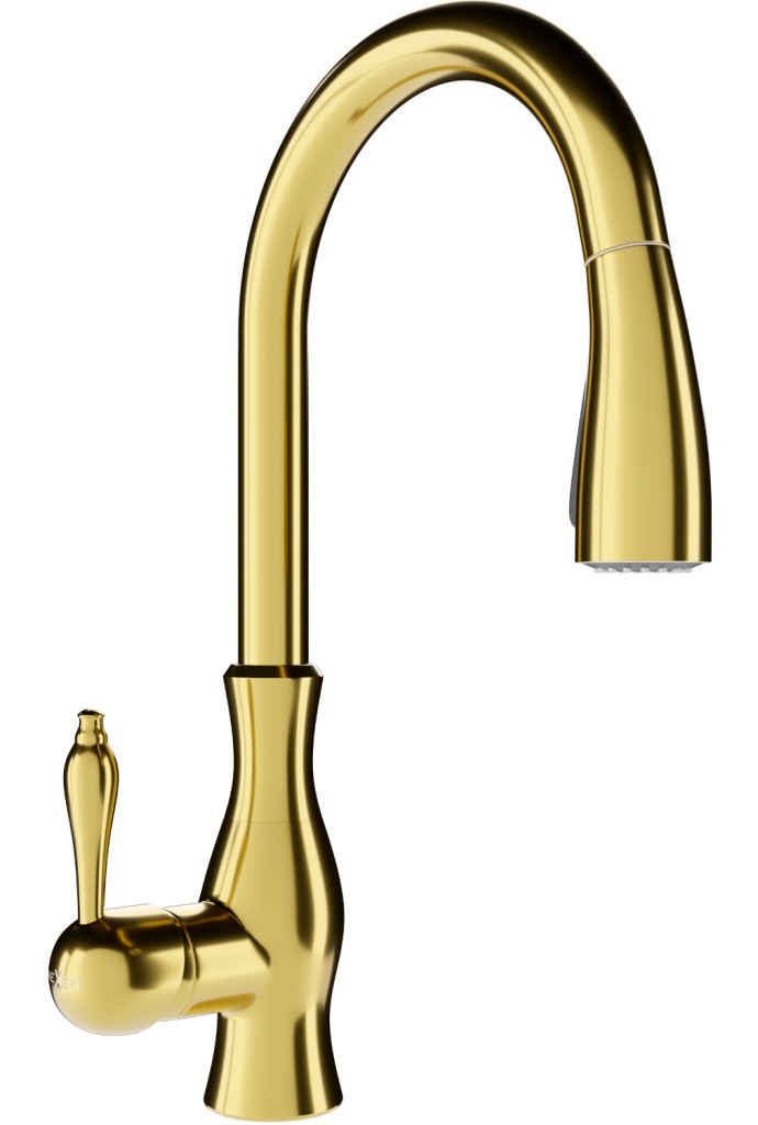 Technické dáta: Materiál: mosadz Povrchová úprava: zlato Hlava: Keramika Perlátor: Áno Typ výtoku: výsuvný Rozsah výtoku: 231 mm Výška: 410 mm Typ: Páka (GT) Ean: 5907709193567