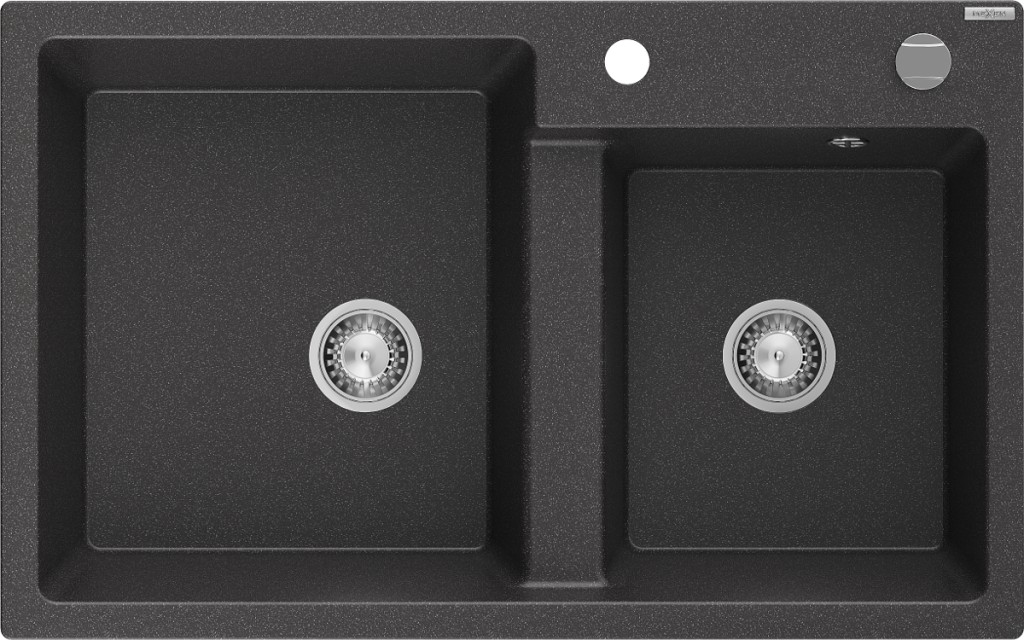 Technické dáta: Rozmer: 800 x 500 x 190 mm Hĺbka komory: 180 mm (väčšia), 180 mm (menšia) Rozmery komory: 440x387 mm (väčšie), 370x303 mm (menšie) Priemer odtoku: ø90 mm Typ: 2-komorový Typ: Zapustené do pracovnej dosky Materiál: žula Farba: Škvrnitá čierna Povrchová úprava sifónu: Chrome Prepadový otvor: Áno Otvor pre batériu: Áno Vrátane automatického sifónu Vysoká odolnosť proti poškriabaniu a zmene farby Odolnosť proti tepelným šokom Ľahko čistiteľný povrch (GT) Ean: 5905315052230