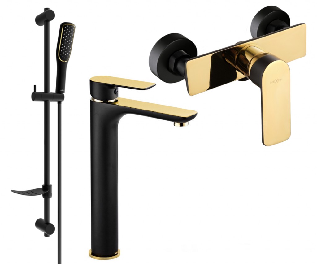 Technické dáta: Materiál umývadlovej batérie: mosadz Povrchová úprava: čierna/zlatá Hlava: Keramická Perlátor: Áno Výška: 290 mm Rozsah výtoku: 200 mm Materiál vaňovej batérie: Mosadz Povrchová úprava: čierna/zlatá Hlava: Keramická Perlátor: Áno Rozsah výtoku: 140 mm Materiál hriadeľa: Nerezová oceľ, ABS Povrchová úprava palice: čierna Výška: 800 mm Šírka lišty: 22 mm Vzdialenosť od steny: 105 mm Miska na mydlo Posuvný držiak na slúchadlo Nastaviteľné montážne držiaky Materiál slúchadiel: Plast Povrchová úprava slúchadiel: čierna/zlatá Počet funkcií: 3 Materiál hadice: PVC Hadie prevedenie: Čierna Dĺžka hadice: 150 cm Mosadzné hroty Hladký povrch uľahčuje údržbu Otočné hroty zabraňujú krúteniu Pružný materiál odolný proti rozťahovaniu a ohýbaniu (GT) Ean: 5907709183469