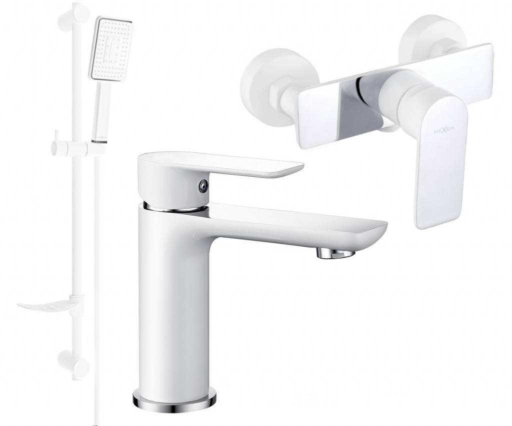 Materiál umývadlovej batérie: mosadz Povrchová úprava: biela / chróm Hlava: Keramická Perlátor: Áno Výška: 160 mm Rozsah výtoku: 170 mm Materiál sprchovej batérie: mosadz Povrchová úprava: biela / chróm Hlava: Keramická Šírka: 170 mm Materiál hriadeľa: Nerezová oceľ, ABS Povrch tyče: Biela Výška: 800 mm Šírka lišty: 22 mm Vzdialenosť od steny: 105 mm Miska na mydlo Posuvný držiak na slúchadlo Nastaviteľné montážne držiaky Materiál slúchadiel: Plast Povrchová úprava slúchadiel: Biela / Chrome Počet funkcií: 1 Materiál hadice: PVC Hadie prevedenie: Biela Dĺžka hadice: 150 cm Mosadzné hroty Hladký povrch uľahčuje údržbu Otočné hroty zabraňujú krúteniu Pružný materiál odolný proti rozťahovaniu a ohýbaniu (GT) Ean: 5907709182783