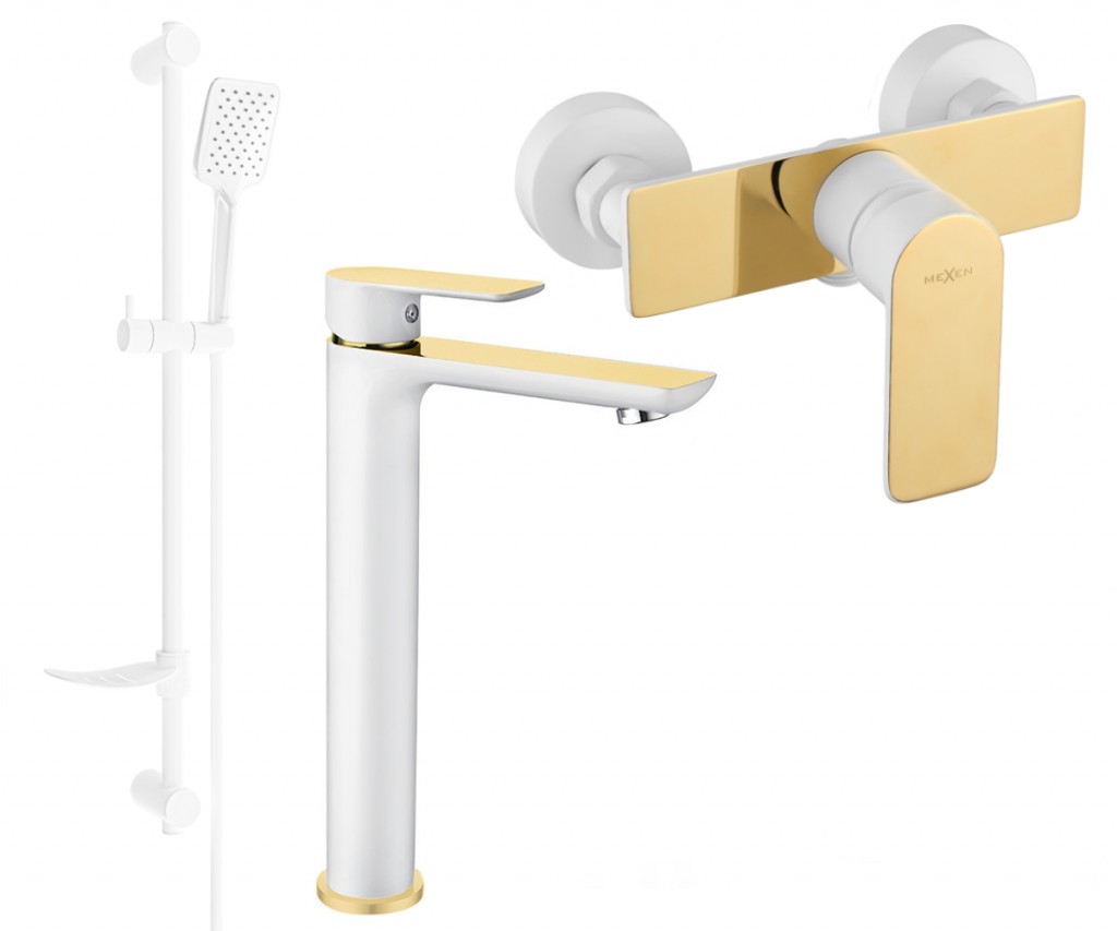 Technické dáta: Materiál umývadlovej batérie: mosadz Povrchová úprava: Biela / Zlatá Hlava: Keramická Perlátor: Áno Výška: 290 mm Rozsah výtoku: 200 mm Materiál vaňovej batérie: Mosadz Povrchová úprava: Biela / Zlatá Hlava: Keramická Perlátor: Áno Rozsah výtoku: 140 mm Materiál hriadeľa: Nerezová oceľ, ABS Povrch tyče: Biela Výška: 800 mm Šírka lišty: 22 mm Vzdialenosť od steny: 160 mm Miska na mydlo Posuvný držiak na slúchadlo Nastaviteľné montážne držiaky Materiál slúchadiel: Plast Povrchová úprava slúchadiel: Biela Počet funkcií: 3 Materiál hadice: PVC Hadie prevedenie: Biela Dĺžka hadice: 150 cm Mosadzné hroty Hladký povrch uľahčuje údržbu Otočné hroty zabraňujú krúteniu Pružný materiál odolný proti rozťahovaniu a ohýbaniu (GT) Ean: 5907709183490