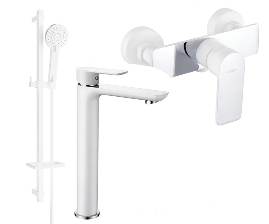 Technické dáta: Materiál umývadlovej batérie: mosadz Povrchová úprava: biela / chróm Hlava: Keramická Perlátor: Áno Výška: 290 mm Rozsah výtoku: 200 mm Materiál vaňovej batérie: Mosadz Povrchová úprava: biela / chróm Hlava: Keramická Perlátor: Áno Rozsah výtoku: 140 mm Materiál hriadeľa: Nerezová oceľ, ABS Povrch tyče: Biela Výška: 800 mm Šírka lišty: 22 mm Vzdialenosť od steny: 160 mm Miska na mydlo Posuvný držiak na slúchadlo Nastaviteľné montážne držiaky Materiál slúchadiel: Plast Povrchová úprava slúchadiel: Biela Počet funkcií: 3 Materiál hadice: PVC Hadie prevedenie: Biela Dĺžka hadice: 150 cm Mosadzné hroty Hladký povrch uľahčuje údržbu Otočné hroty zabraňujú krúteniu Pružný materiál odolný proti rozťahovaniu a ohýbaniu (GT) Ean: 5907709183346