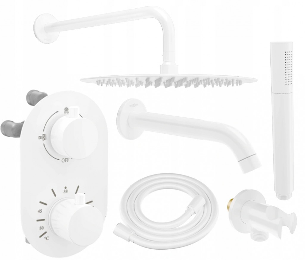 Technické dáta: Materiál batérie: mosadz Hlava: Termostatická Povrchová úprava: Biela Pripojenie: 2x G 1/2" vstup a 3x G 1/2" výstup Blokovanie horúcej vody pri 38 °C Sada: Diel pre zapustenú a povrchovú montáž Materiál dažďovej sprchy: nerezová oceľ S304 Povrchová úprava: Biela Rozmery: ø30 cm Štandardné 1/2" pripojenie Hrúbka: 2 mm Povrch kotúča je odolný proti zmatneniu a korózii Dažďová sprcha má gumové trysky, ktoré zabraňujú usadzovaniu vodného kameňa Materiál ramena: nerezová oceľ S304 Povrchová úprava: Biela Typ montáže: Montáž na stenu Dĺžka: 40 cm Šírka: 20 mm Štandardné 1/2" pripojenie Uhol ohybu ramena: 90° Povrch je odolný proti zmatneniu a korózii Materiál hubica: mosadz Povrchová úprava: Biela Rozsah výtoku: 174 mm Vzdialenosť od steny: 184 cm Rozmery rozety: ø52 Typ: Nástenná Pripojenie: 1/2 palca Perlátor: Áno Spojovací materiál: mosadz Povrchová úprava: Biela Typ montáže: Montáž na stenu Rozmery rozety: ø50 mm Vzdialenosť od steny: 55 mm Štandardné 1/2" pripojenie Materiál slúchadiel: mosadz Povrchová úprava: Biela Počet funkcií: 1 Pripojenie: G 1/2" Výška: 200 mm Šírka: 35 mm Materiál hadice: PVC Povrchová úprava: Biela Dĺžka hadice: 150 cm Pripojenie: 1/2" Mosadzné hroty Hladký povrch uľahčuje údržbu Otočné hroty zabraňujú krúteniu Pružný materiál odolný proti roztiahnutiu a ohybu (GT) Ean: 5907709136571