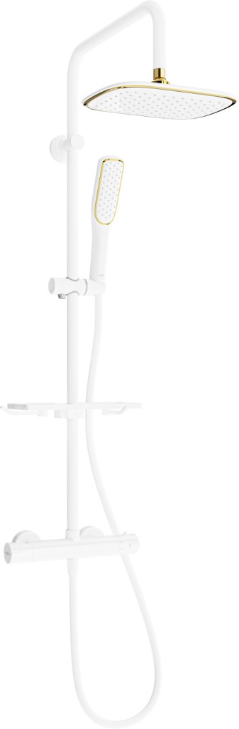 Technické dáta: Materiál stĺpa: nerezová oceľ, ABS Povrchová úprava stĺpika: Biela Výška: 970 mm Šírka stĺpika: 22 mm Vzdialenosť od steny: 400 mm Miska na mydlo Posuvný držiak slúchadlá Nastaviteľné montážne držiaky Materiál dažďovej sprchy: plast Povrchová úprava dažďa: biele zlato Veľkosť dažďovej sprchy: 255x195 mm Materiál slúchadiel: plast Povrchová úprava slúchadiel: biela / zlatá Počet funkcií: 1 Materiál hadice: PVC Povrchová úprava hadice: biela Dĺžka hadice: 150 cm mosadzné hroty Hladký povrch uľahčuje udržiavanie čistoty Otočné hroty zabraňujú krúteniu Pružný materiál odolný proti roztiahnutiu a ohnutiu Materiál Faucet: Telo z mosadze Povrchová úprava baterie: biela Hlava: termostatická Pripojenie: G3 / 4 "(hore) a G1 / 2" (dole) Pripojenie Rostav: 150 mm Blokovanie horúcej vody pri 38 ° C (GT) Ean: 5907709141896