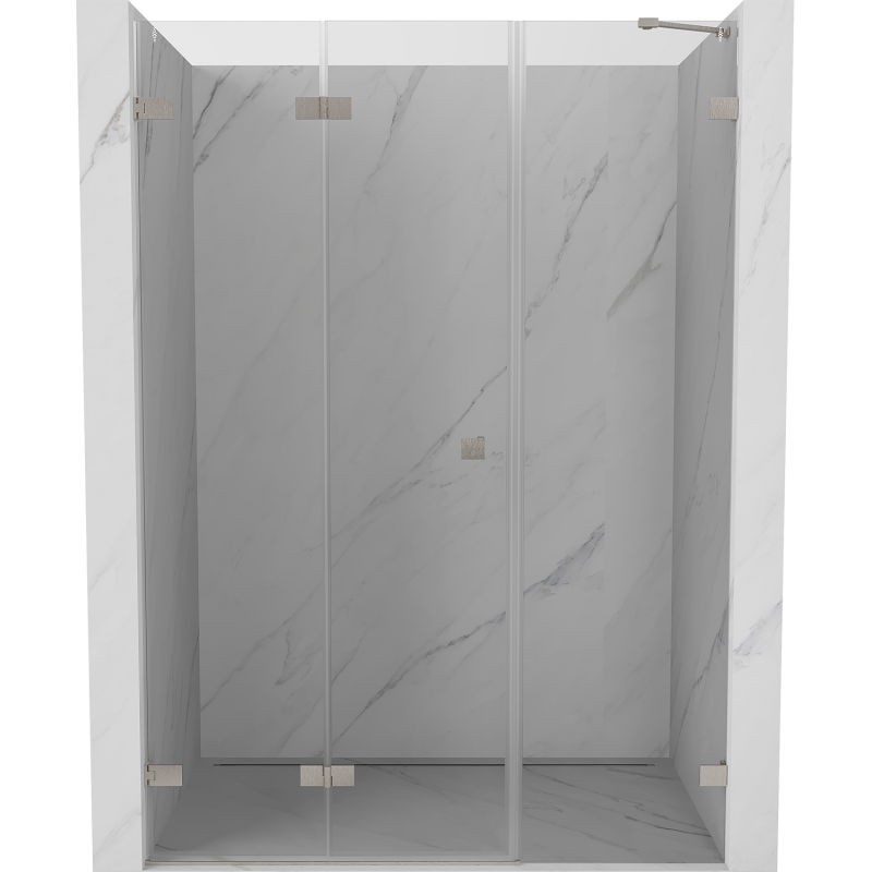 Špecifikácia produktu: Rozmer: 125x200 cm Strana montáže: Ľavá Vstup: Skladacie Farba skla: Priehľadná Povrchová úprava: Kartáčovaný nikel Profil: Hliník Typ skla: Tvrdené Hrúbka skla: dvere 6 mm, stena 8 mm Ľahko čistiteľný povlak Možnosť nastavenia šírky Dva montážne systémy: - S profilom, ktorý umožňuje vyrovnanie nerovností stien - Bez profilu pre dokonale rovné steny Možno namontovať na sprchovú vaničku alebo dlaždice Mosadzné spony a pánty v jednej rovine so sklenenou tabuľou Magnetický prúžok a elastomérové tesnenia na odvod vody Hliníkový prah tesnenia dverí(GT) Ean: 5905315512482
