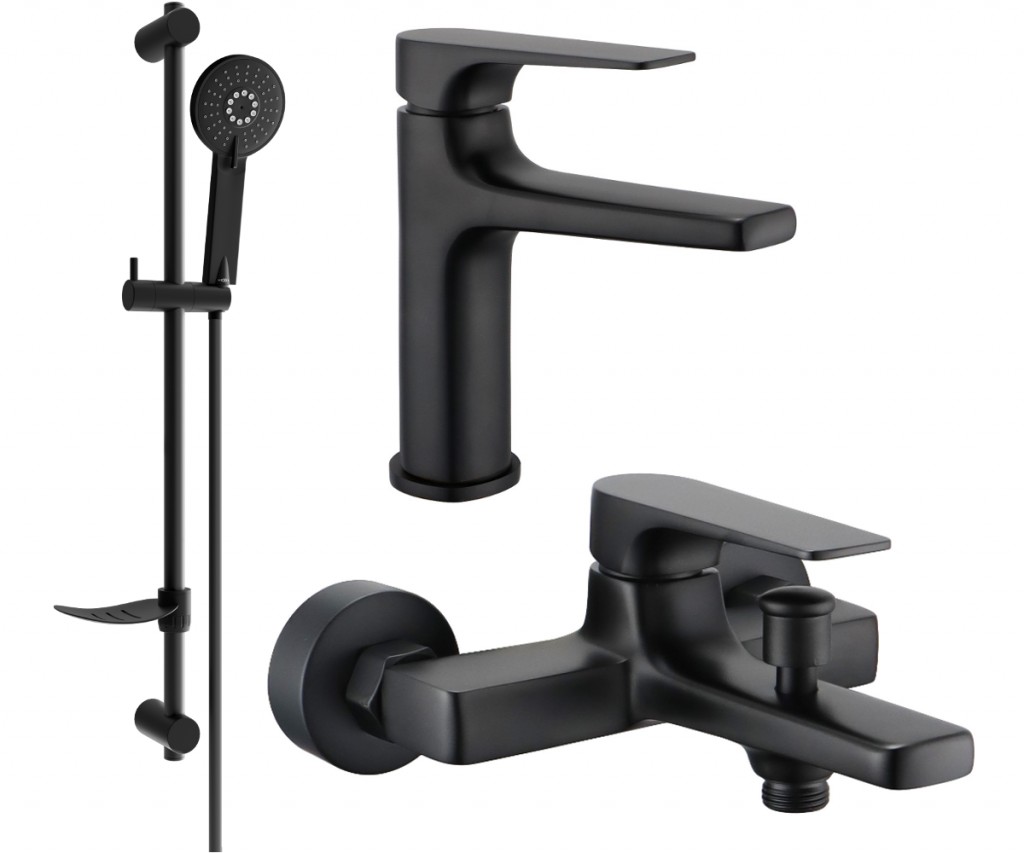 Technické dáta: Materiál umývadlovej batérie: mosadz Povrchová úprava: čierna Hlava: Keramická Perlátor: Áno Výška: 165 mm Dosah výtoku: 114 mm Materiál vaňovej batérie: mosadz Povrchová úprava: čierna Hlava: Keramická Perlátor: Áno Rozsah výtoku: 115 mm Materiál hriadeľa: Nerezová oceľ, ABS Povrchová úprava palice: čierna Výška: 800 mm Šírka lišty: 22 mm Vzdialenosť od steny: 105 mm Miska na mydlo Posuvný držiak na slúchadlo Nastaviteľné montážne držiaky Materiál slúchadiel: Plast Povrchová úprava slúchadiel: čierna Počet funkcií: 3 Výška slúchadla: 240 mm Rozmery hlavy: ø108 mm Materiál hadice: PVC Povrchová úprava had: zlatá Dĺžka hadice: 150 cm Mosadzné hroty Hladký povrch uľahčuje údržbu Otočné hroty zabraňujú krúteniu Pružný materiál odolný proti rozťahovaniu a ohýbaniu (GT) Ean: 5907709185272