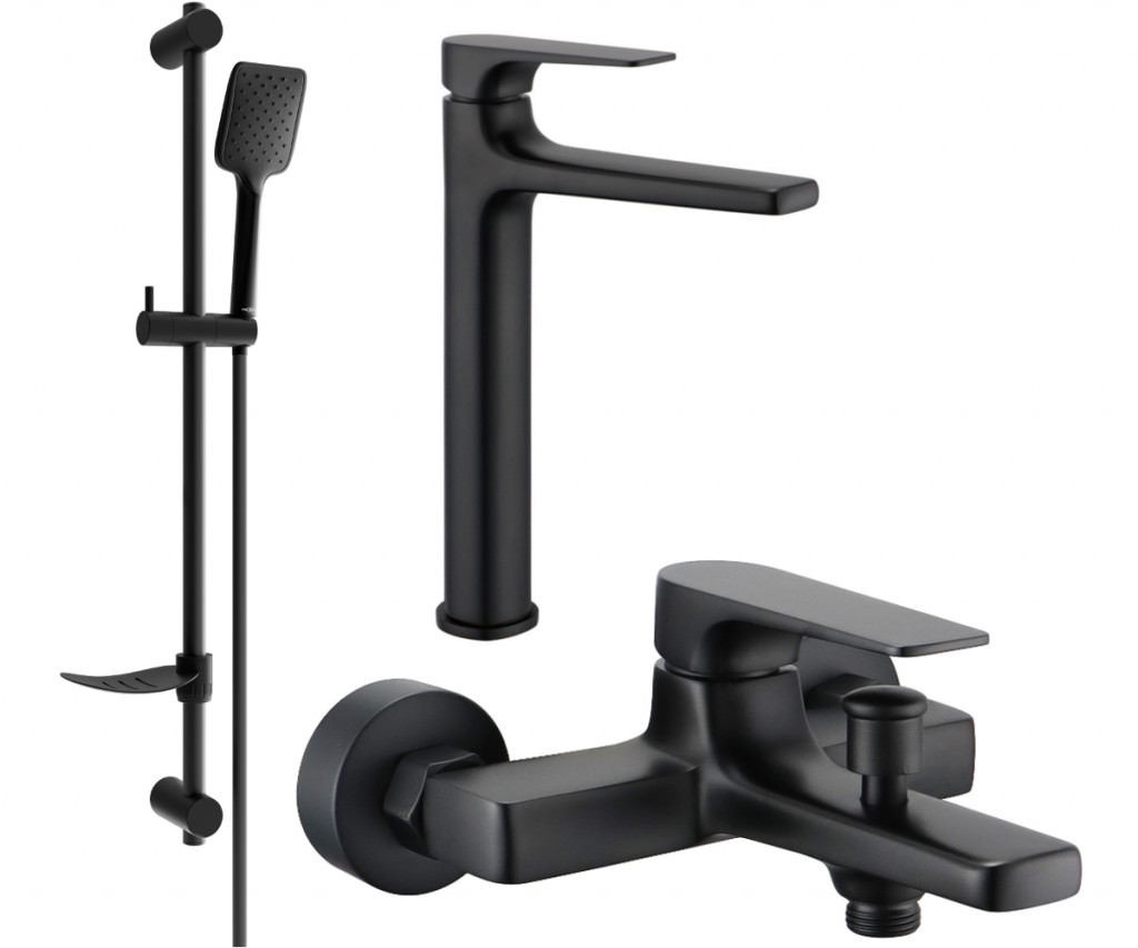 Technické dáta: Materiál umývadlovej batérie: mosadz Povrchová úprava: čierna Hlava: Keramická Perlátor: Áno Výška: 276 mm Dosah výtoku: 142 mm Materiál vaňovej batérie: Mosadz Povrchová úprava: čierna Hlava: Keramická Perlátor: Áno Rozsah výtoku: 115 mm Materiál hriadeľa: Nerezová oceľ, ABS Povrchová úprava palice: čierna Výška: 800 mm Šírka lišty: 22 mm Vzdialenosť od steny: 105 mm Miska na mydlo Posuvný držiak na slúchadlo Nastaviteľné montážne držiaky Materiál slúchadiel: Plast Povrchová úprava slúchadiel: čierna Počet funkcií: 1 Materiál hadice: PVC Hadie prevedenie: Čierna Dĺžka hadice: 150 cm Mosadzné hroty Hladký povrch uľahčuje údržbu Otočné hroty zabraňujú krúteniu Pružný materiál odolný proti rozťahovaniu a ohýbaniu (GT) Ean: 5907709185401