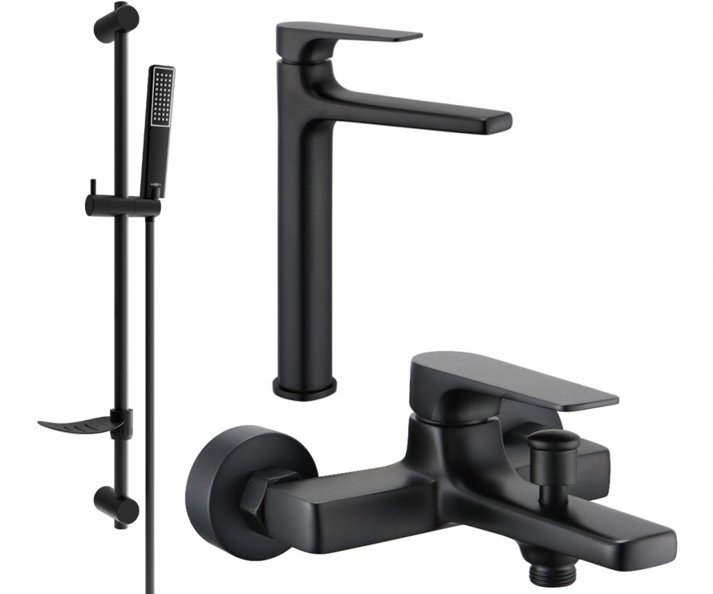 Technické dáta: Materiál umývadlovej batérie: mosadz Povrchová úprava: čierna Hlava: Keramická Perlátor: Áno Výška: 276 mm Dosah výtoku: 142 mm Materiál vaňovej batérie: mosadz Povrchová úprava: čierna Hlava: Keramická Perlátor: Áno Rozsah výtoku: 115 mm Materiál hriadeľa: Nerezová oceľ, ABS Povrchová úprava palice: čierna Výška: 800 mm Šírka lišty: 22 mm Vzdialenosť od steny: 105 mm Miska na mydlo Posuvný držiak na slúchadlo Nastaviteľné montážne držiaky Materiál slúchadiel: Plast Povrchová úprava slúchadiel: čierna Počet funkcií: 1 Materiál hadice: PVC Hadie prevedenie: Čierna Dĺžka hadice: 150 cm Mosadzné hroty Hladký povrch uľahčuje údržbu Otočné hroty zabraňujú krúteniu Pružný materiál odolný proti rozťahovaniu a ohýbaniu (GT) Ean: 5907709185456