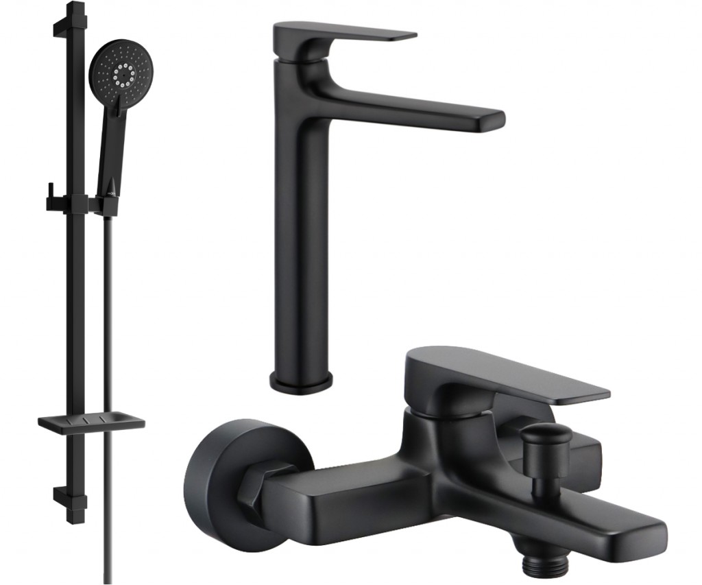 Technické dáta: Materiál umývadlovej batérie: mosadz Povrchová úprava: čierna Hlava: Keramická Perlátor: Áno Výška: 276 mm Dosah výtoku: 142 mm Materiál vaňovej batérie: mosadz Povrchová úprava: čierna Hlava: Keramická Perlátor: Áno Rozsah výtoku: 115 mm Materiál hriadeľa: Nerezová oceľ, ABS Povrchová úprava palice: čierna Výška: 800 mm Šírka lišty: 22 mm Vzdialenosť od steny: 160 mm Miska na mydlo Posuvný držiak na slúchadlo Nastaviteľné montážne držiaky Materiál slúchadiel: Plast Povrchová úprava slúchadiel: čierna Počet funkcií: 3 Materiál hadice: PVC Hadie prevedenie: Čierna Dĺžka hadice: 150 cm Mosadzné hroty Hladký povrch uľahčuje údržbu Otočné hroty zabraňujú krúteniu Pružný materiál odolný proti rozťahovaniu a ohýbaniu (GT) Ean: 5907709185357
