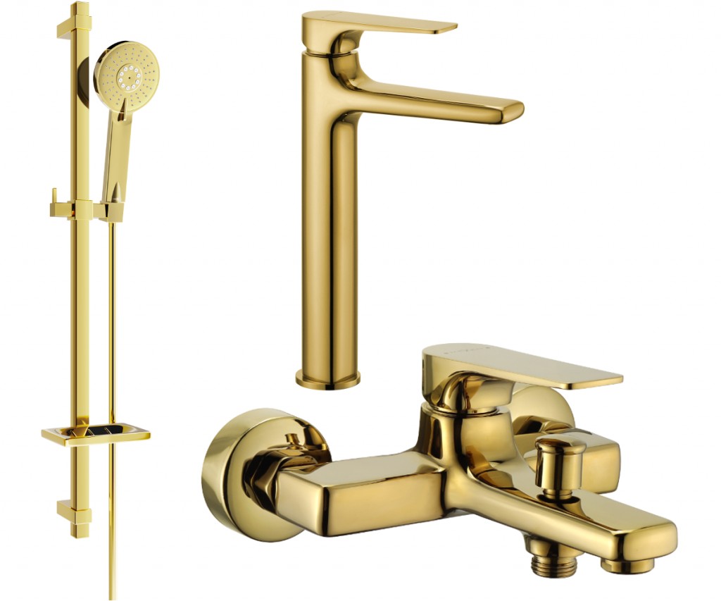 Technické dáta: Materiál umývadlovej batérie: mosadz Povrchová úprava: zlatá Hlava: Keramická Perlátor: Áno Výška: 276 mm Dosah výtoku: 142 mm Materiál vaňovej batérie: Mosadz Povrchová úprava: zlatá Hlava: Keramická Perlátor: Áno Rozsah výtoku: 115 mm Materiál hriadeľa: Nerezová oceľ, ABS Povrchová úprava palice: zlatá Výška: 800 mm Šírka lišty: 22 mm Vzdialenosť od steny: 160 mm Miska na mydlo Posuvný držiak na slúchadlo Nastaviteľné montážne držiaky Materiál slúchadiel: Plast Povrchová úprava slúchadiel: zlatá Počet funkcií: 3 Materiál hadice: PVC Povrchová úprava had: zlatá Dĺžka hadice: 150 cm Mosadzné hroty Hladký povrch uľahčuje údržbu Otočné hroty zabraňujú krúteniu Pružný materiál odolný proti roztiahnutiu a ohybu (GT) Ean: 5907709185340