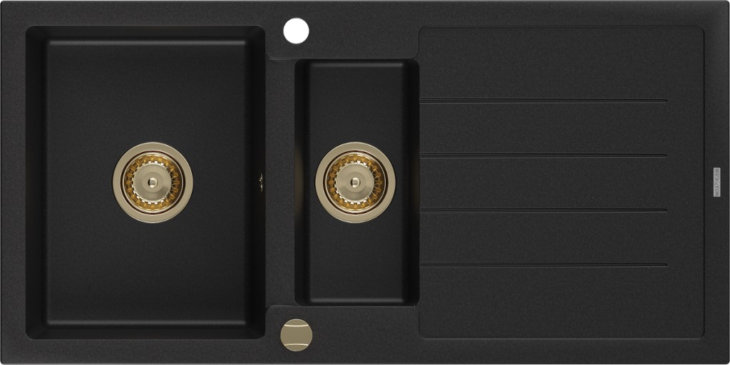 Technické dáta: Rozmer: 1000x500x200 mm Hĺbka komory: 190 mm (väčšia), 115 mm (menšia) Rozmery komory: 430x330 mm (väčšie), 340x170 mm (menšie) Priemer odtoku: ø90 mm Typ: 1,5-miska s odkvapkávačom Typ: Zapustené do pracovnej dosky Materiál: žula Čierna farba Povrchová úprava sifónu: zlatá Prepadový otvor: Áno Otvor pre batériu: Áno Vrátane automatického sifónu Vysoká odolnosť proti poškriabaniu a zmene farby Odolnosť proti tepelným šokom Povrch pre ľahké čistenie (GT) Ean: 5905315012319