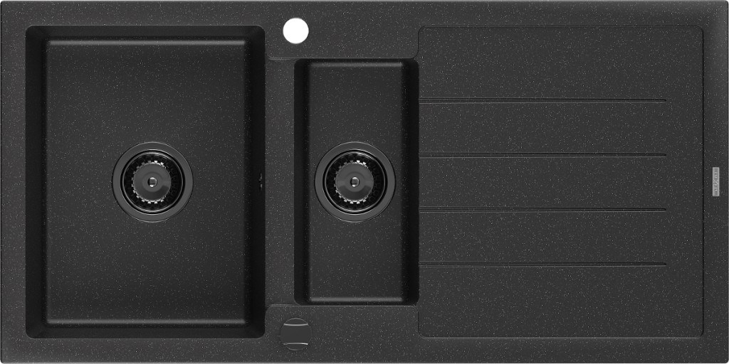 Technické dáta: Rozmer: 1000x500x200 mm Hĺbka komory: 190 mm (väčšia), 115 mm (menšia) Rozmery komory: 430x330 mm (väčšie), 340x170 mm (menšie) Priemer odtoku: ø90 mm Typ: 1,5-miska s odkvapkávačom Typ: Zapustené do pracovnej dosky Materiál: žula Farba: čierna/strieborná metalíza Povrchová úprava sifónu: čierna Prepadový otvor: Áno Otvor pre batériu: Áno Vrátane automatického sifónu Vysoká odolnosť proti poškriabaniu a zmene farby Odolnosť proti tepelným šokom Povrch pre ľahké čistenie (GT) Ean: 5905315013477